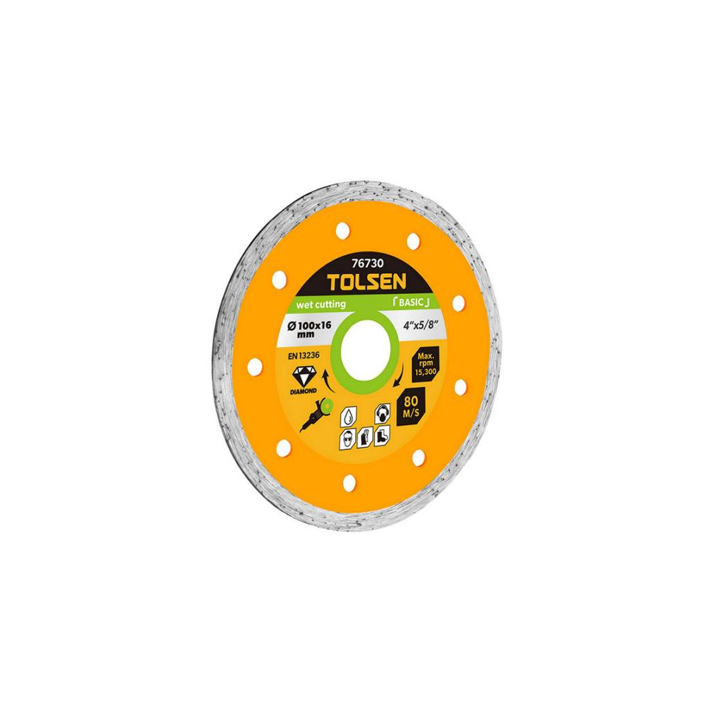 Диск алмазний суцільний 125 х 22 мм, сегмент 5 мм Tolsen – це високоякісний інструмент, призначений для різання таких матеріалів, як керамічна плитка, бетон, мармур, граніт тощо. Завдяки суцільній ріжучій кромці диск забезпечує точний та чистий зріз, зменшуючи кількість сколів на оброблюваній поверхні. Діаметр диска становить 125 мм, а посадковий отвір 22 мм, що робить його сумісним з більшістю кутових шліфувальних машин. Висота сегмента 5 мм підвищує зносостійкість та продуктивність інструменту, забезпечуючи тривалий термін служби навіть при інтенсивному використанні.
