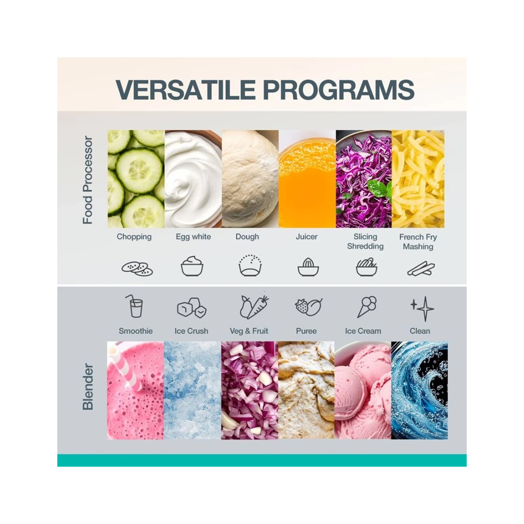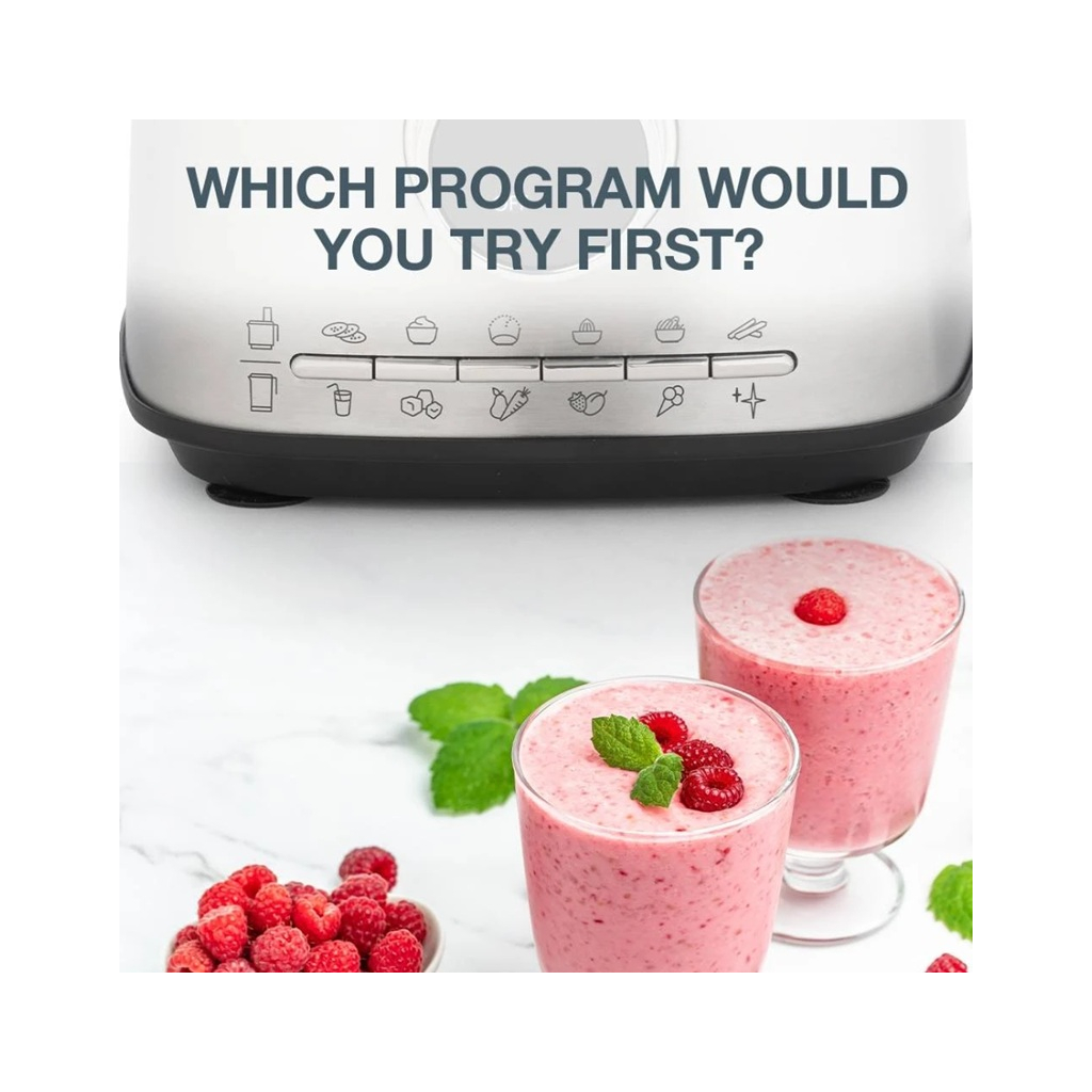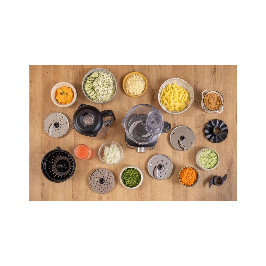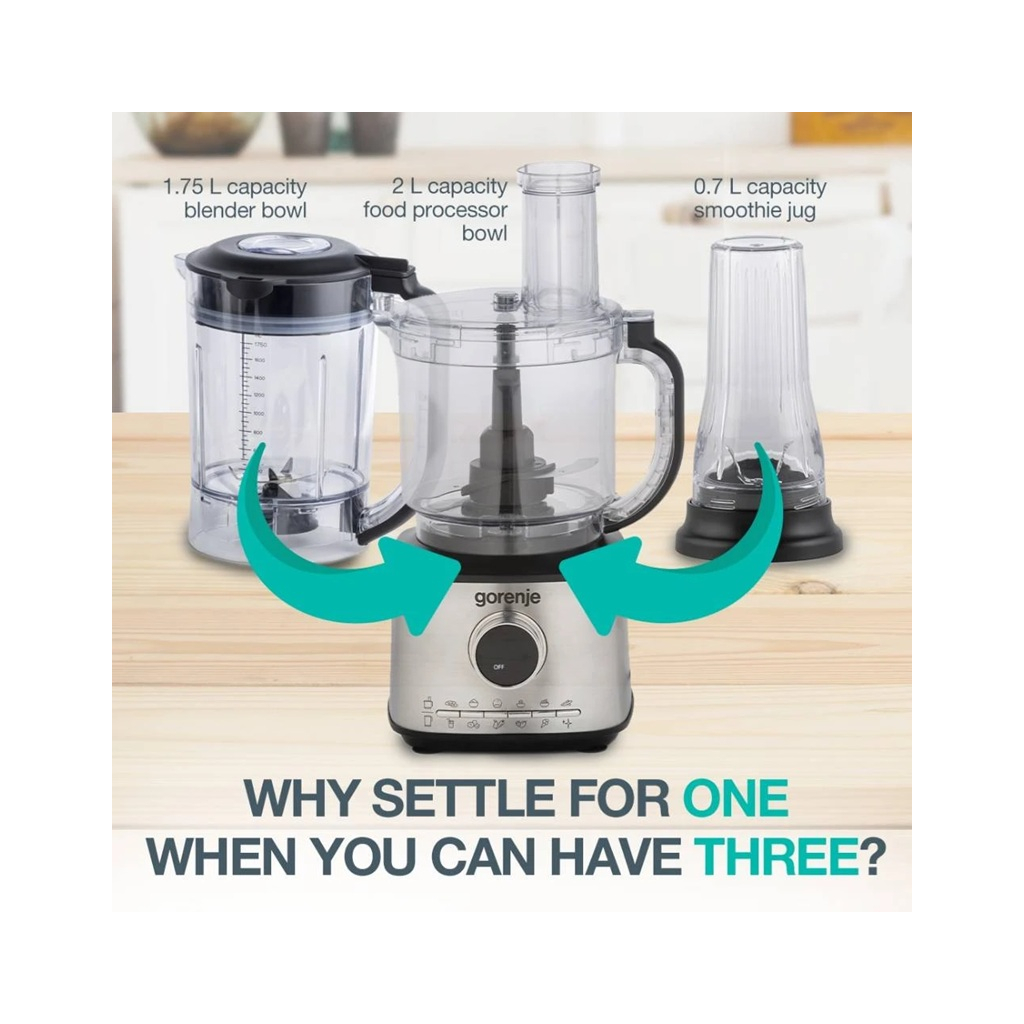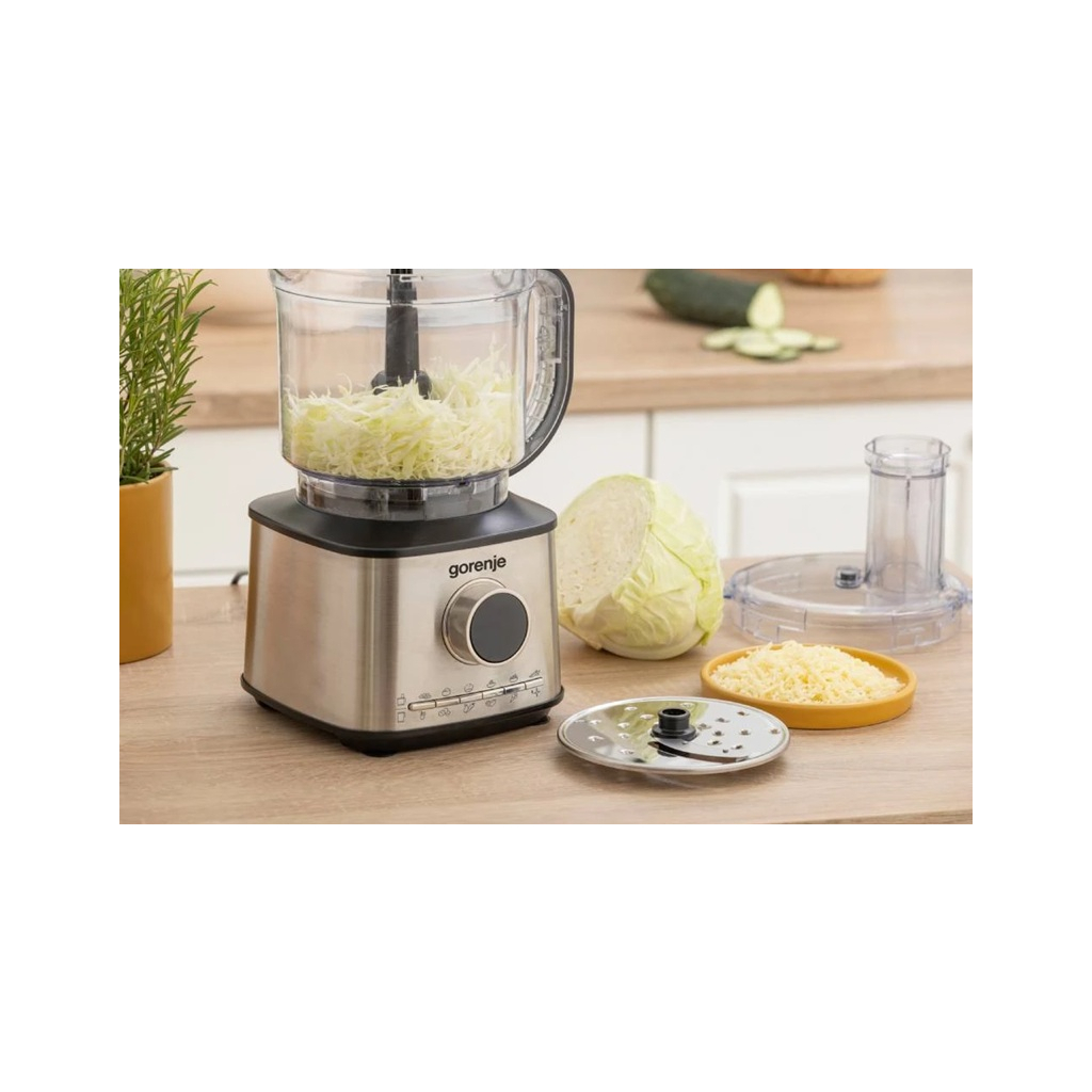 Gorenje SBR1500E — універсальний кухонний комбайн, що поєднує потужність, функціональність та надійність, спрощуючи процес приготування страв. Технічні характеристики Потужність: 1500 Вт, що забезпечує ефективну роботу з тестом, збиванням та подрібненням. Об’єм основної чаші: 2 літри — зручний для приготування середніх обсягів. Об’єм чаші блендера: 1,75 літра, дозволяє готувати супи, соуси, напої. Матеріали: корпус із металу й пластику; чаша — з нержавіючої сталі. Насадки в комплекті: міксер для тіста; блендер; емульсійна насадка для збивання; терка. Функції : Режим "пульс" — для коротких, інтенсивних імпульсних включень. Дисплей — для відображення налаштувань. Програма