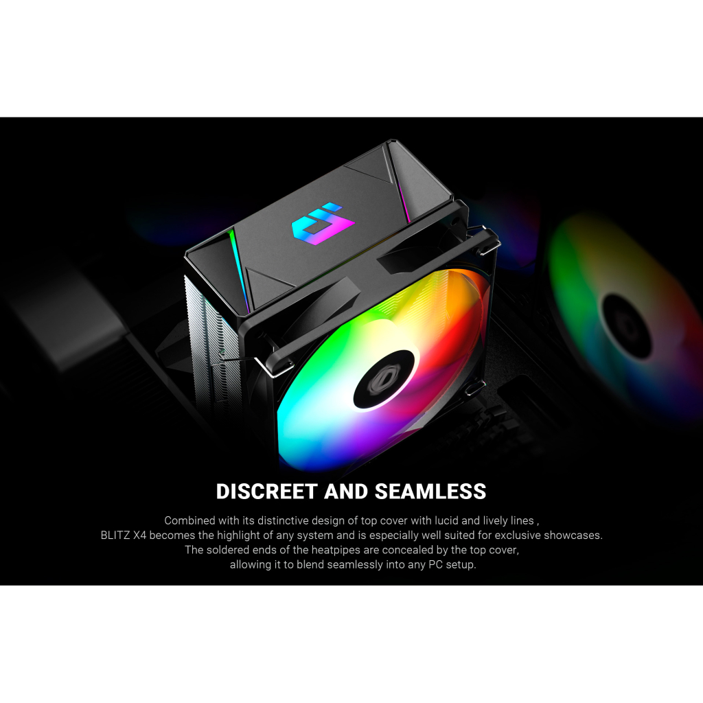 Кулер ID-Cooling BLITZ X4 має 4 теплові трубки для ефективного відведення тепла, а також підтримує управління швидкістю обертання через 4-pin PWM. Його повітряний потік становить 76.16 CFM, що забезпечує оптимальне охолодження, а рівень шуму в 27 dB гарантує тиху роботу. Чорний колір та стильне RGB підсвічування роблять цей кулер не лише функціональним, а й естетично привабливим доповненням до вашої системи.