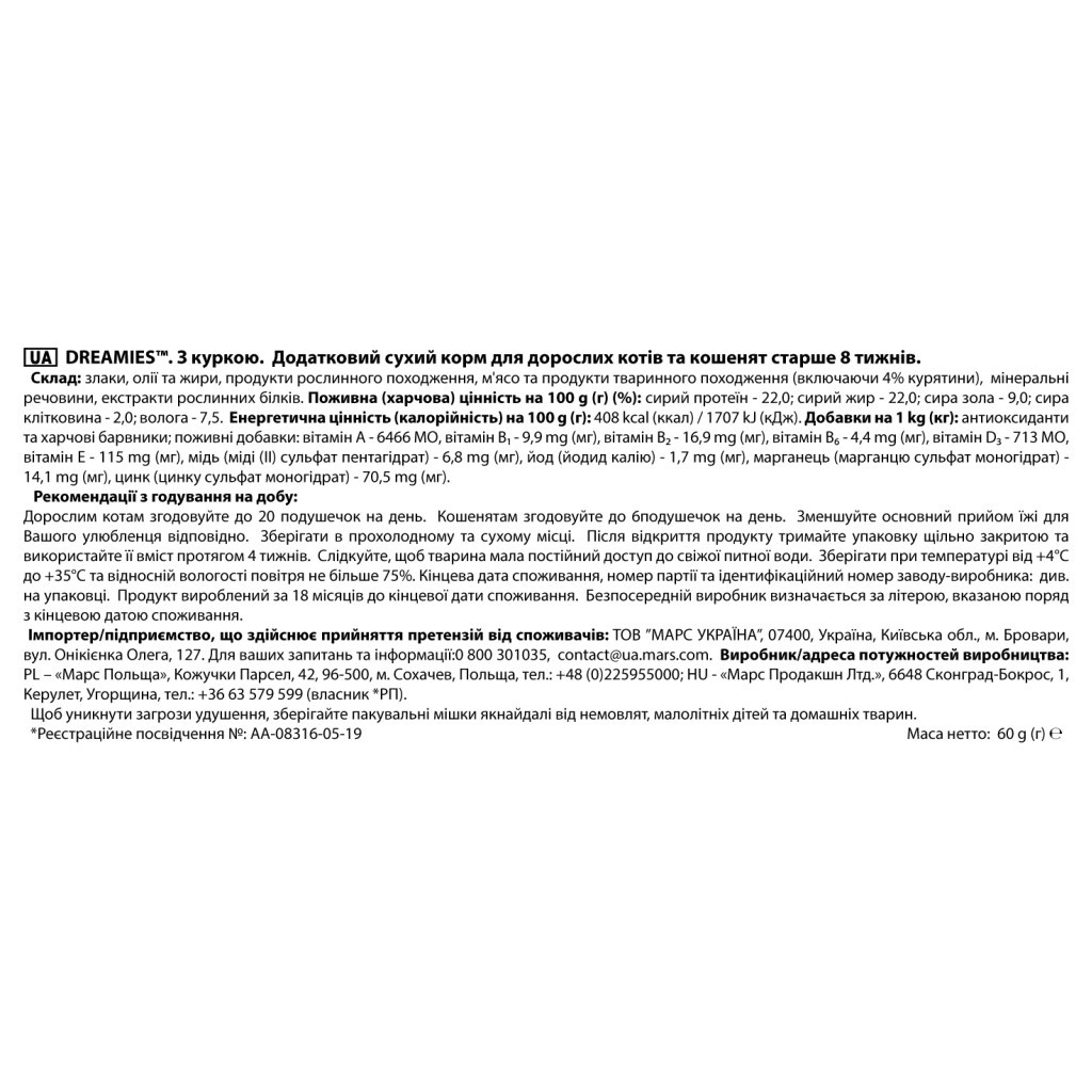 Ласощі для котів Dreamies з куркою 60 г – це ідеальний вибір для вашого улюбленця. Ці смачні снеки мають хрустку скоринку та ніжну начинку, що робить їх незамінними у раціоні котів. Котики просто не можуть устояти перед неперевершеним смаком Dreamies. Вони містять вітаміни та мінерали, що сприяють гарному самопочуттю вашого пухнастика.