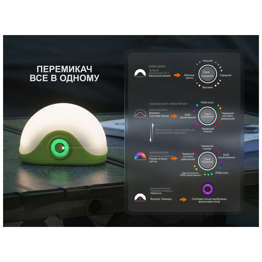 - 13 режимів яскравості, включаючи місячне сяйво з потужністю 1 лм на 320 годин.