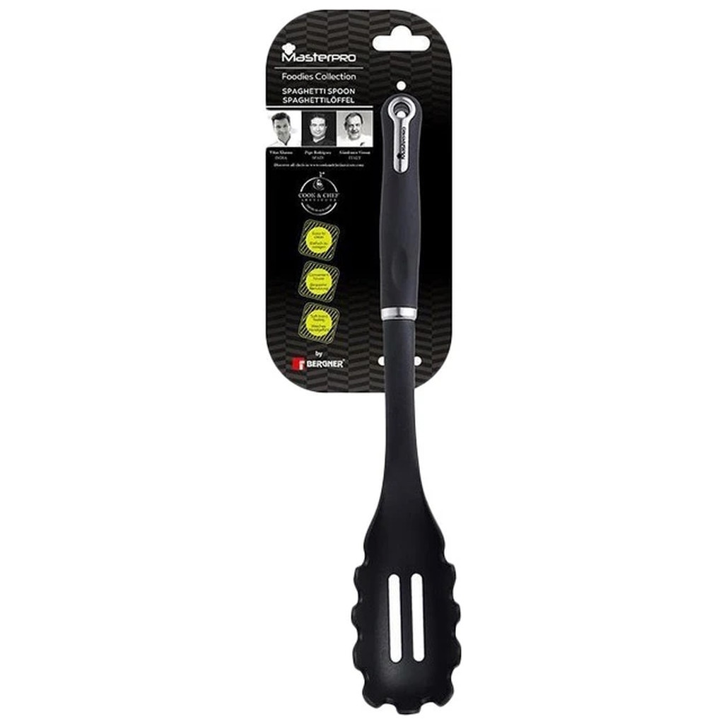 Ложка кухарська MasterPro Foodies collection для спагеті (BGMP-4589) — це незамінний кухонний прилад, який допоможе вам легко і швидко готувати улюблені страви з макаронів. Виготовлена з термостійкого нейлону, вона має антипригарне покриття, що запобігає прилипання їжі. Завдяки ергономічній м’якій ручці, ви зможете зручно тримати ложку під час приготування. Розміри ложки складають 34,5 х 6 х 5,6 см, що робить її ідеальною для обробки довгих макаронних виробів.
