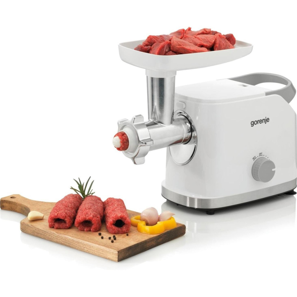 Основні технічні характеристики Gorenje MG1802SJW: максимальна потужність – 1800 Вт, номінальна потужність – 350 Вт, продуктивність – 2.1 кг/хв. Модель обладнана функцією "Реверс", що дозволяє уникнути забивання м'ясорубки. В комплект входять два диски для фаршу з діаметрами отворів 3 мм та 8 мм, а також різноманітні насадки: для томатів, «кеббе», ковбасок, шинкування та терки. Габарити м'ясорубки складають 306 х 290 х 200 мм, а вага – 3.9 кг.