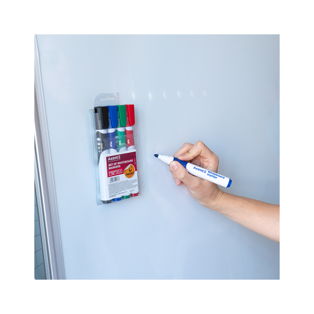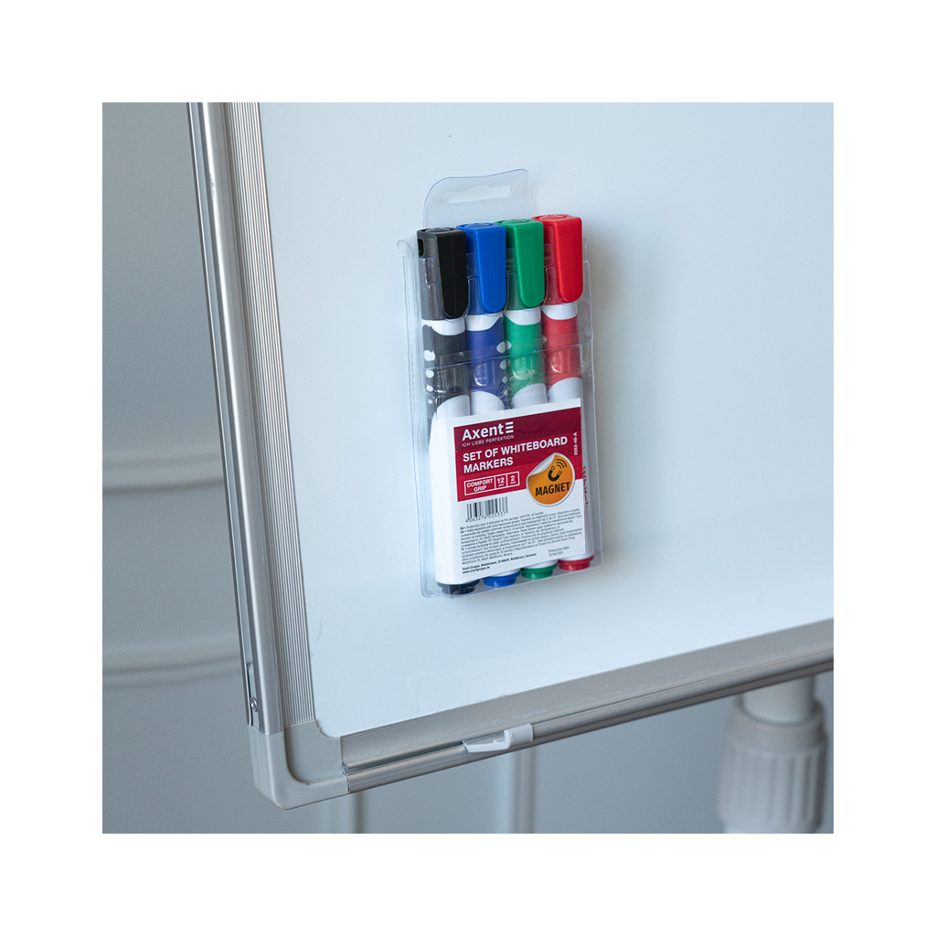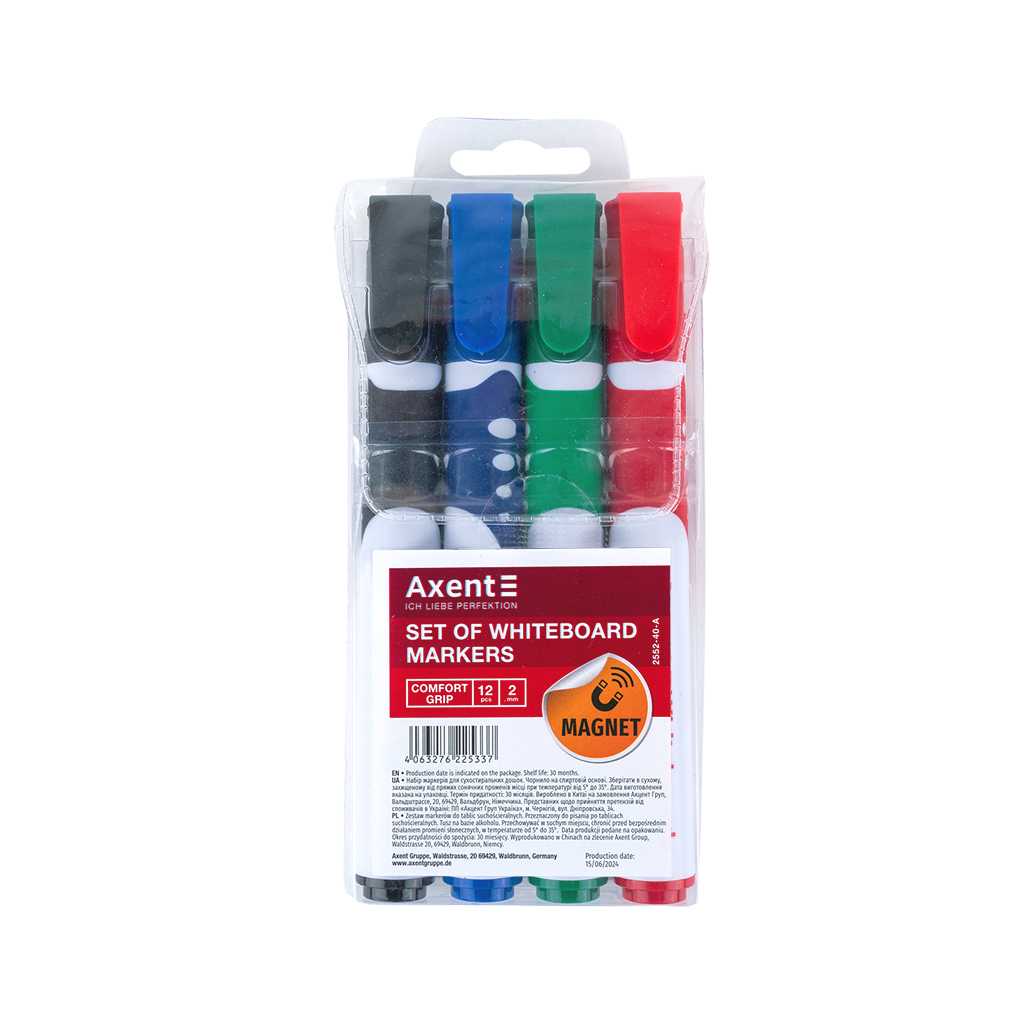 Набір маркерів Axent Whiteboard Comfort Grip 2552-40-A складається з 4 кольорів: червоний, синій, зелений, чорний. У наборі є магніт для закріплення упаковки до дошки.