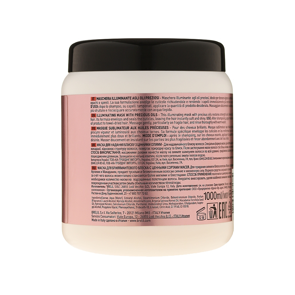 Brelil Numero для надання блиску з цінними оліями – професійна маска для волосся об'ємом 1 л, що забезпечує зволоження, відновлення, живлення та блиск. Ідеально підходить для всіх типів волосся, особливо для тонкого, надаючи їм здоровий вигляд і шовковистість.
