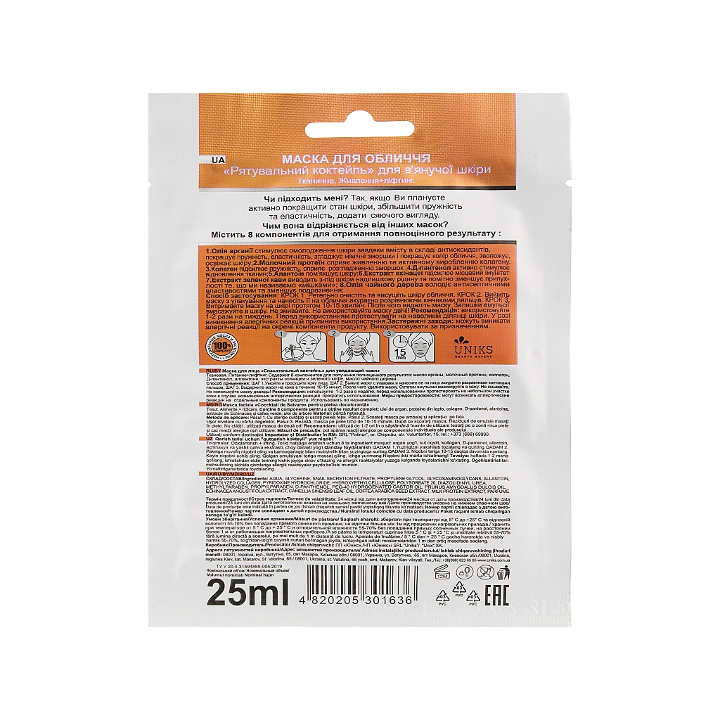 Спосіб застосування: очистіть шкіру обличчя, нанесіть маску на 10-15 хвилин, після чого зніміть її і вмасажуйте залишки емульсії в шкіру. Не змивайте.