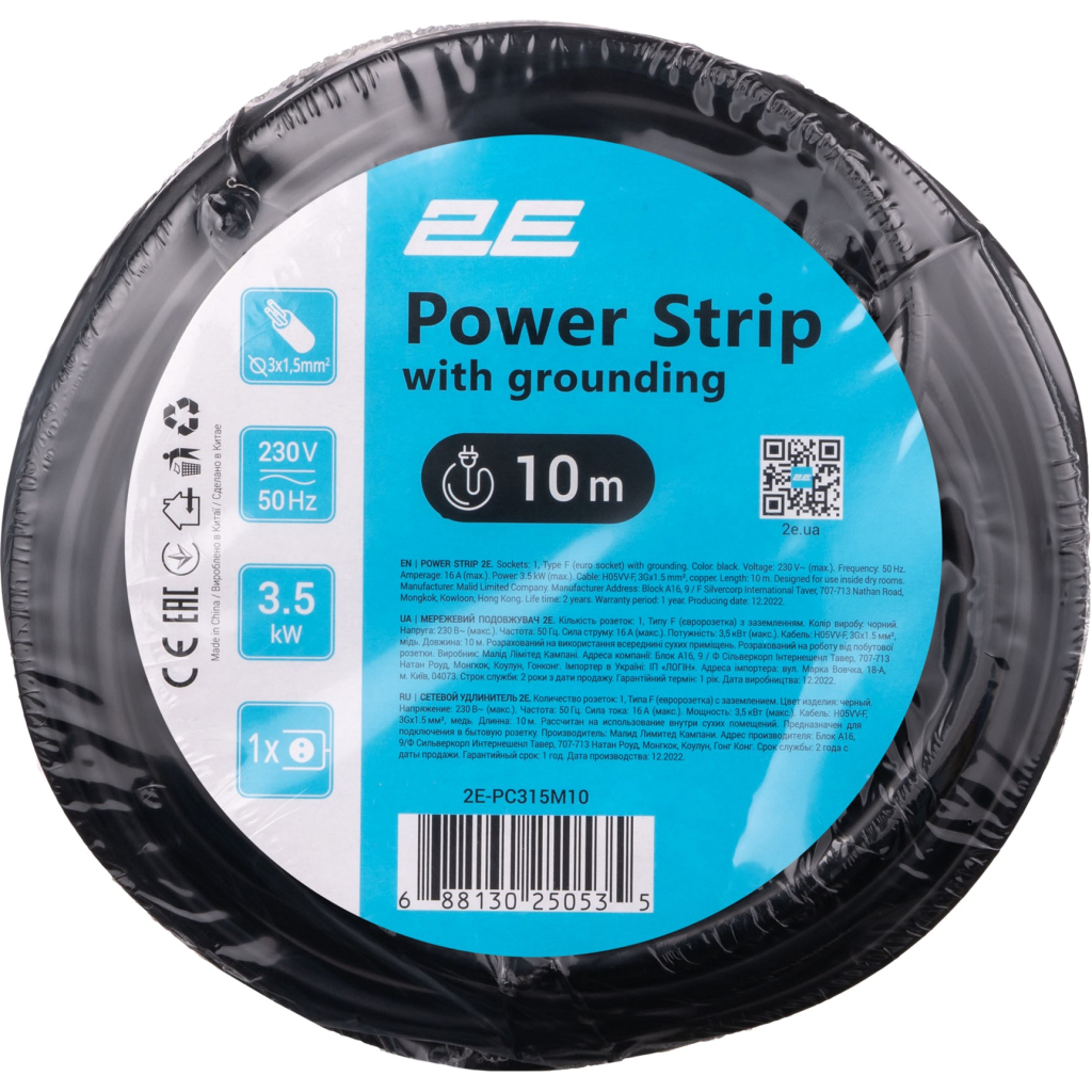 Мережевий подовжувач 2Е на 1 розетку Типу F (євророзетка із заземленням), вилка Типу F (євровилка із заземленням), H05VV-F 3G*1.5мм2, 10 метрів, колір чорний. Мережевий подовжувач 2Е призначений для під’єднання широкого спектра комп’ютерної, побутової та електронної техніки до електричної мережі. Кабель завдовжки 10 м дає змогу підключати техніку у віддалених в місцях від стаціонарних розеток. Подовжувач оснащений вилкою та розеткою євростандарту. Мережевий подовжувач 2Е – чудовий помічник у квартирі, в офісі та на дачі.