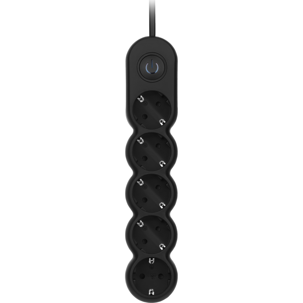 Надійний мережевий подовжувач 2E модель U04VESM3BK особливого дизайну, із заземленням, вимикачем із синім підсвічуванням і захисними шторками. Для вертикального кріплення передбачено отвори. Має п’ять розеток типу Schuko (F). Призначено для побутових і комп’ютерних пристроїв. Колір виробу – чорний, довжина кабелю 3 м.