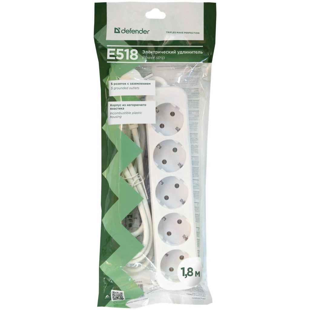 Електричний подовжувач Defender призначений для підведення електрики у важкодоступні місця і/або під’єднання до однієї розетки декількох пристроїв одночасно. Корпус із непального пластику, 5 розеток із заземленням.