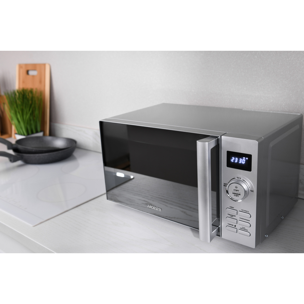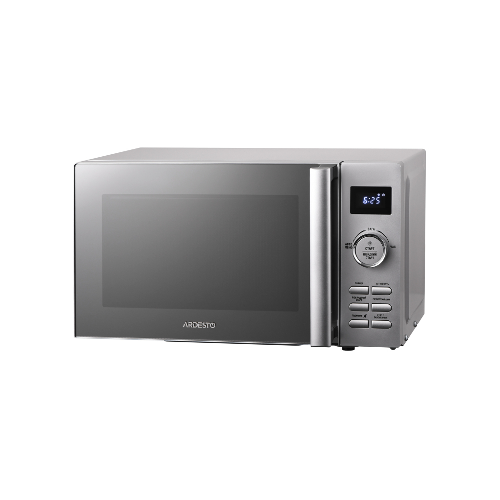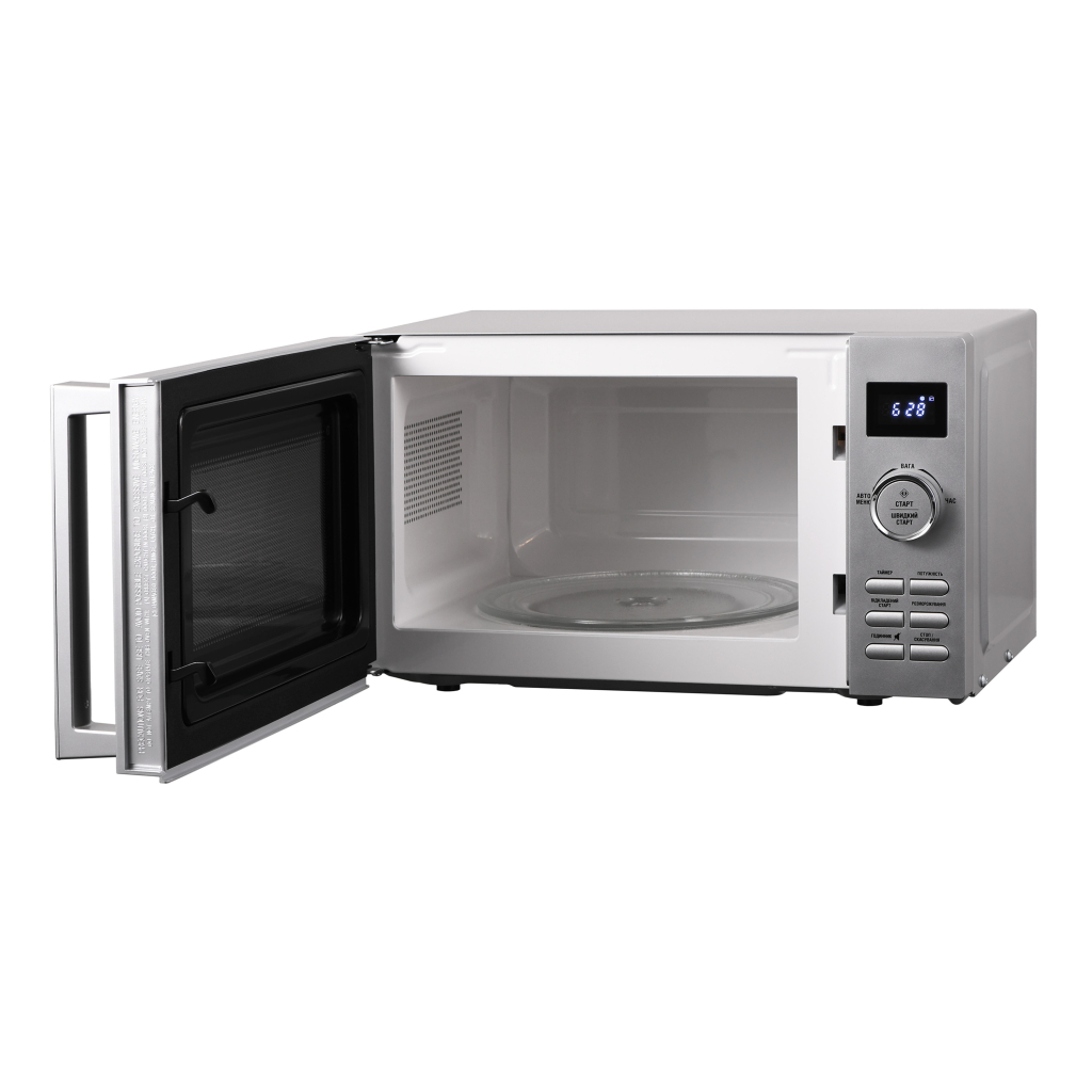Мікрохвильова піч сріблястого кольору із дзеркальними дверцятами, електронним керуванням та дисплеєм. Потужність GO-E745S – 700 Вт, є п’ять рівнів регулювання, а внутрішній об’єм дорівнює 20 л.