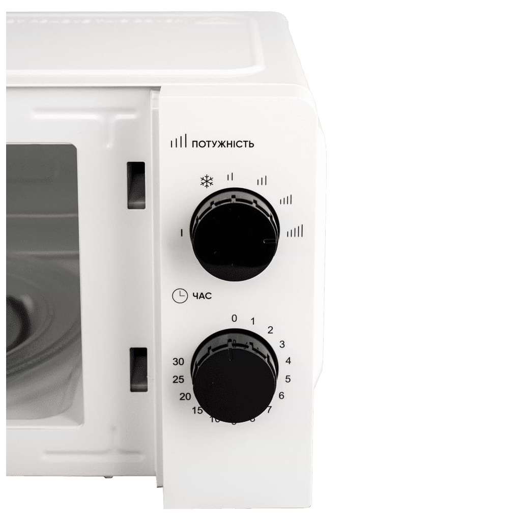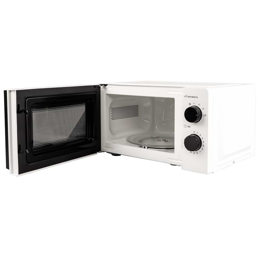 Основні технічні характеристики включають механічне керування, що дозволяє легко налаштовувати режим роботи. Мікрохвильова піч має 5 рівнів потужності та функцію розморожування, що додає зручності у використанні. Внутрішнє покриття з емалі забезпечує легке очищення, а діаметр поворотного піддону 245 мм дозволяє рівномірно прогрівати їжу. Габарити пристрою: ширина 44.8 см, глибина 32.9 см, висота 24.5 см, вага 9 кг. Колір – білий.