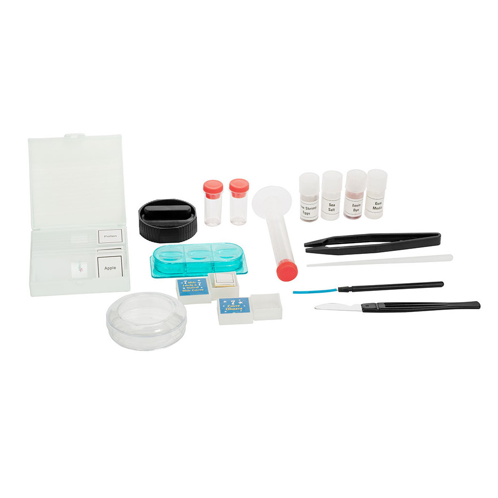 - Комплектація: 7 предметних скел, 7 покривних скел, 5 підготовлених слайдів, 2 контейнери для препаратів, еозин, морська сіль та gum media.
