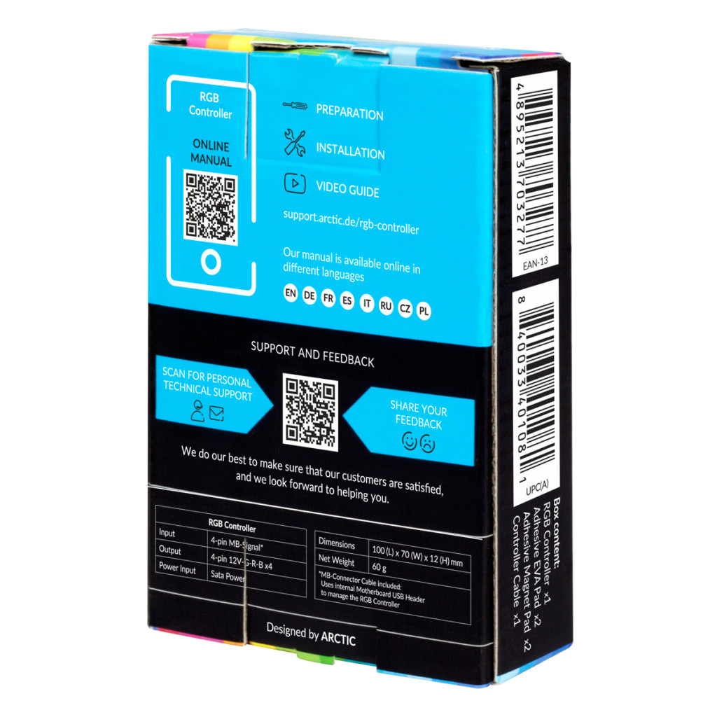 RGB-контролер має чотири стандартизовані 4-контактні роз’єми RGB, які можна використовувати для підключення та керування не лише власними RGB-пристроями ARCTIC. Їх можна синхронізувати або керувати ними незалежно один від одного.