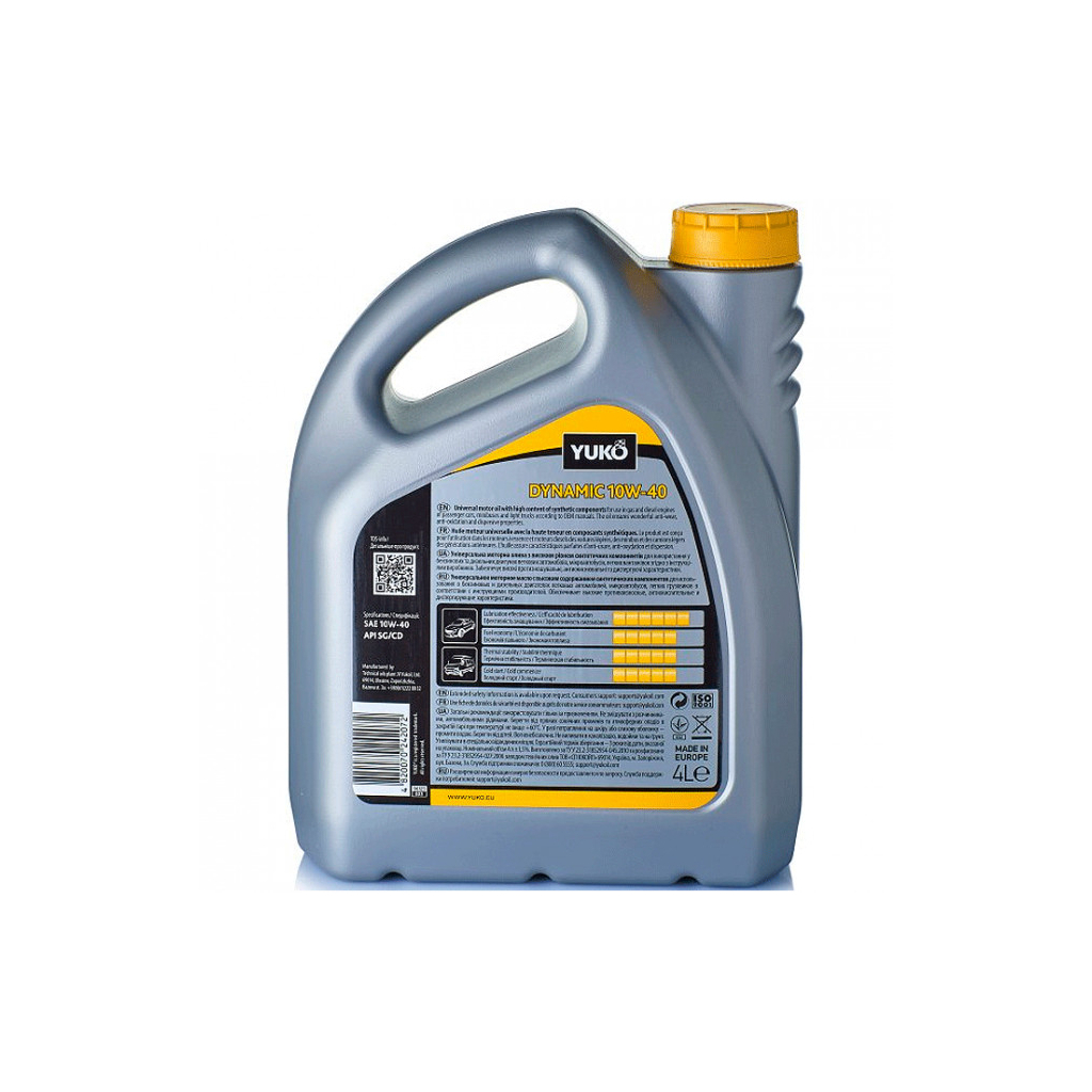 Основні технічні характеристики Yuko DYNAMIC 10W-40 включають: тип основи оливи – напівсинтетичне, в'язкість за SAE – 10W-40, категорії техніки – легкові та вантажні автомобілі, а також класифікація API – CD та SG. Виробництво здійснюється в Україні, що підтверджує високу якість продукту.