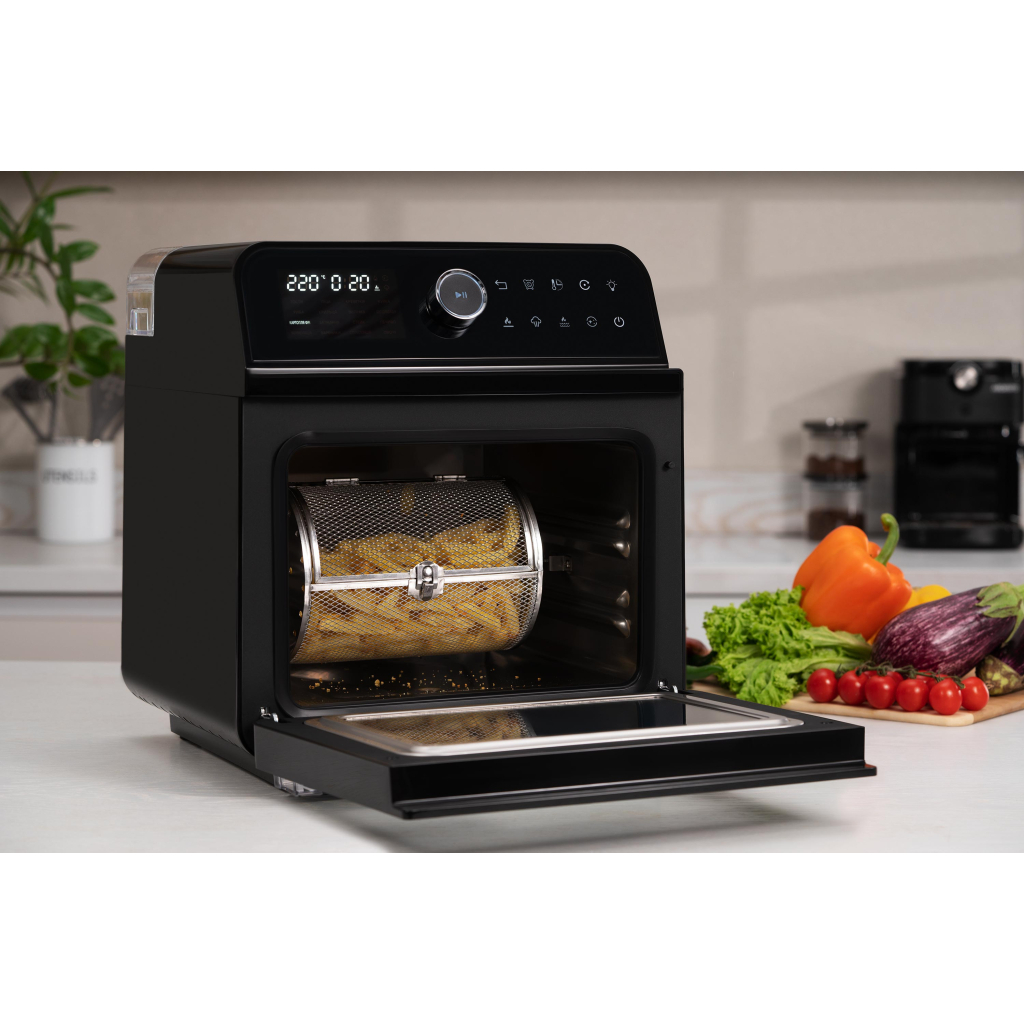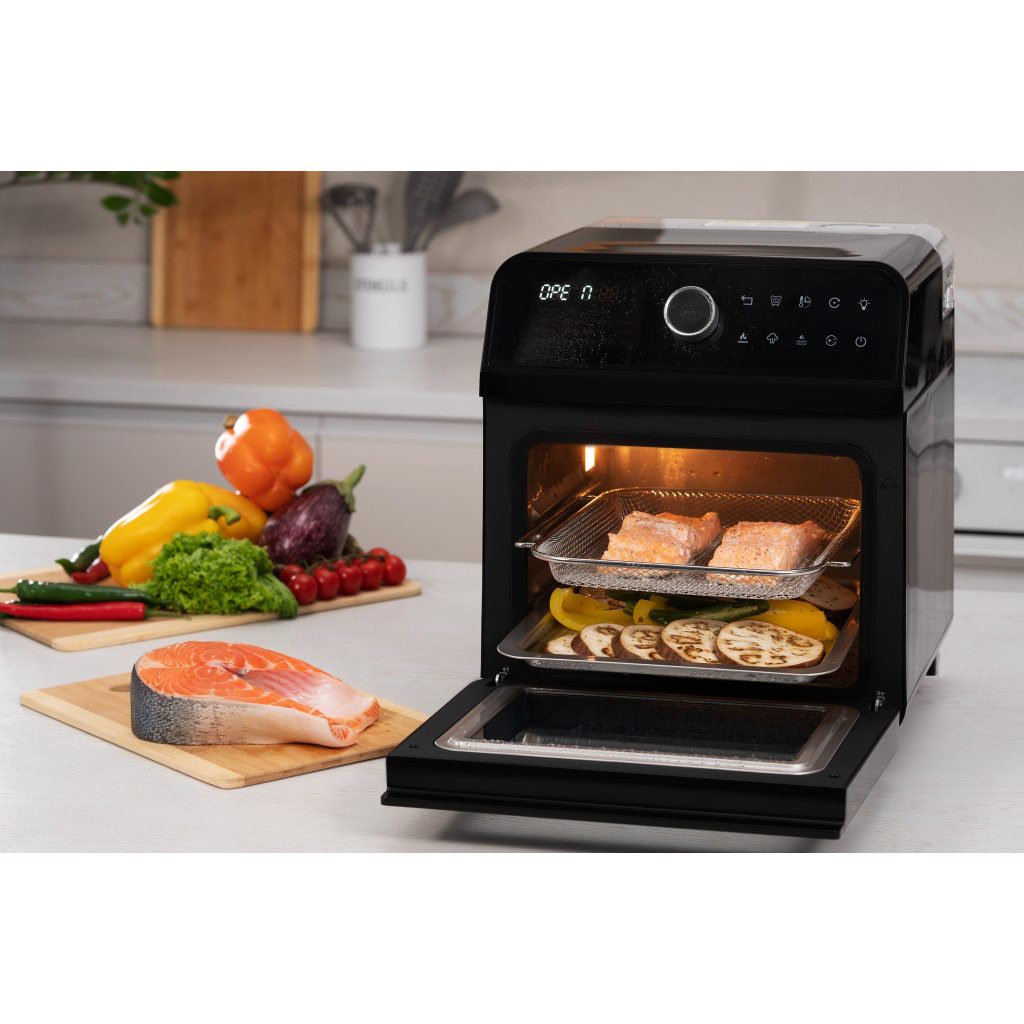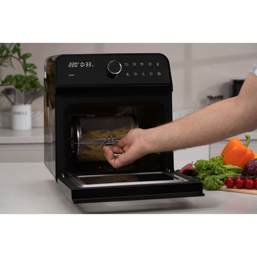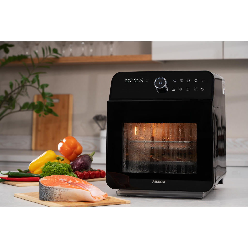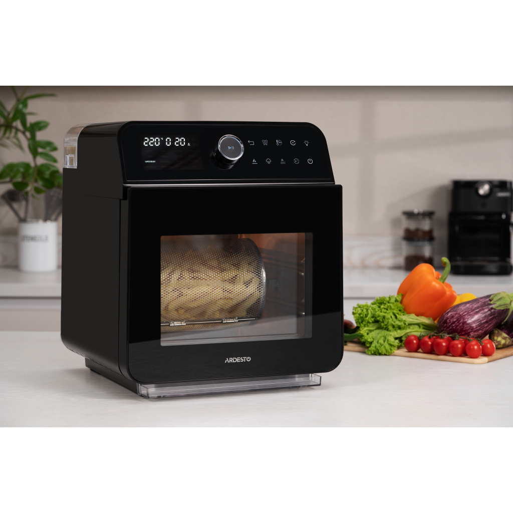 Мультипіч ARDESTO дає змогу готувати здорові страви без додавання олії або за мінімальної її кількості. Можна вибрати з-поміж 16 автоматичних програм та експериментувати з конвекційним нагрівом, приготуванням на парі чи комбінованим режимом. Ефективна циркуляція повітря, функція відкладеного старту та сенсорне керування з поворотним регулятором роблять користування піччю максимально зручним. До того ж і догляд за пристроєм не спричинить складнощі, адже передбачено функцію очищення від накипу. Піч оснащено LED-дисплеєм, внутрішнім освітленням, індикацією закінчення приготування, запобіжним вимикачем і захистом від перегрівання. Об’єм мультипечі становить 15 л, а потужність – 2 250 Вт. У комплекті: рожен, решітка для гриля, сітчасте деко, обертовий кошик, щипці для рожна та піддон для збору рідин і крихт.