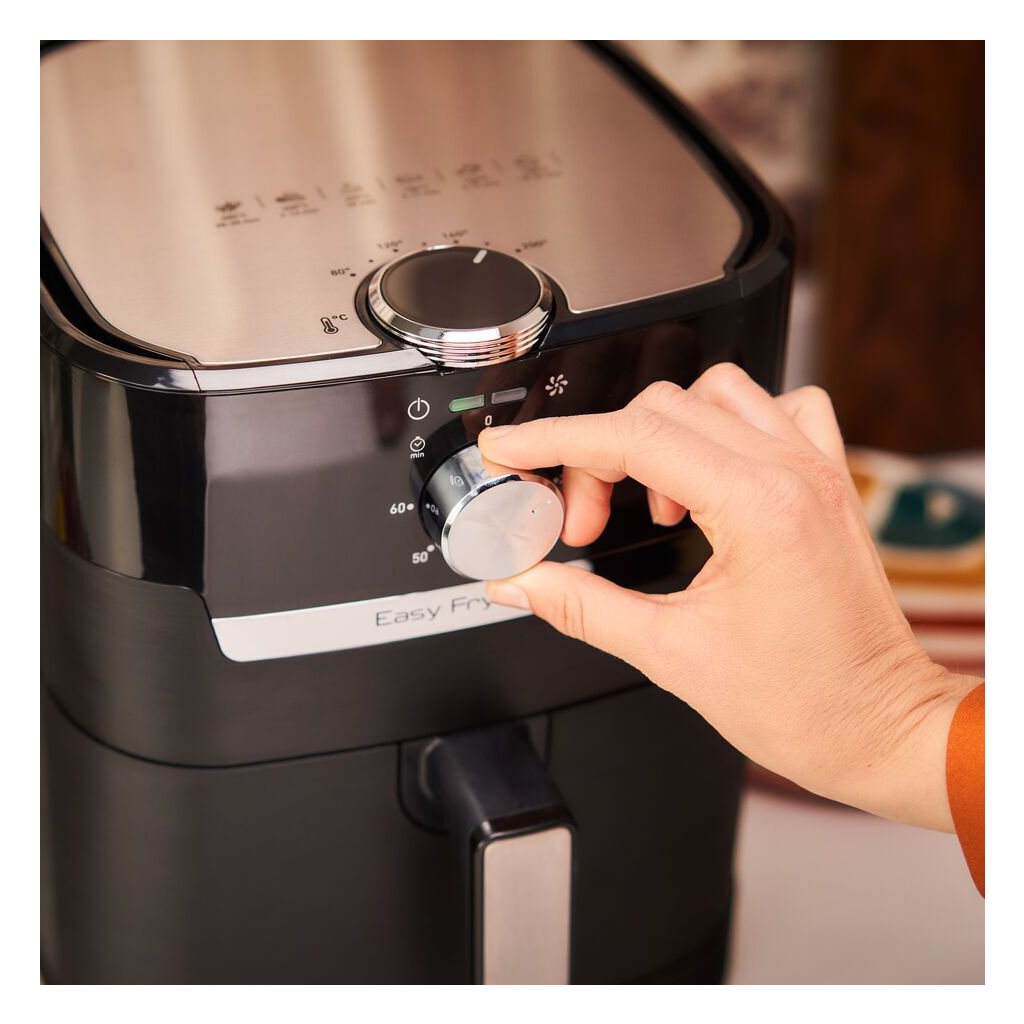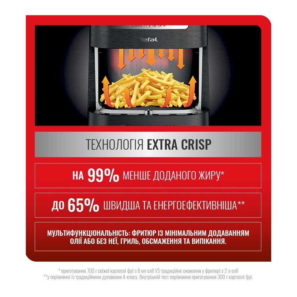 Технологія Extra crisp пропонує ідеальний баланс температури і потоку гарячого повітря для отримання хрусткої золотистої скоринки з невеликим додаванням олії або без додавання олії – насолоджуйтесь приготуванням з додаванням на 99% менше олії, ніж при звичайній смаженні! На 99% менше додавання олії: 700 г свіжої картоплі фрі, приготованої з 8 мл олії, в порівнянні з традиційною жаркою з 2 л олії.