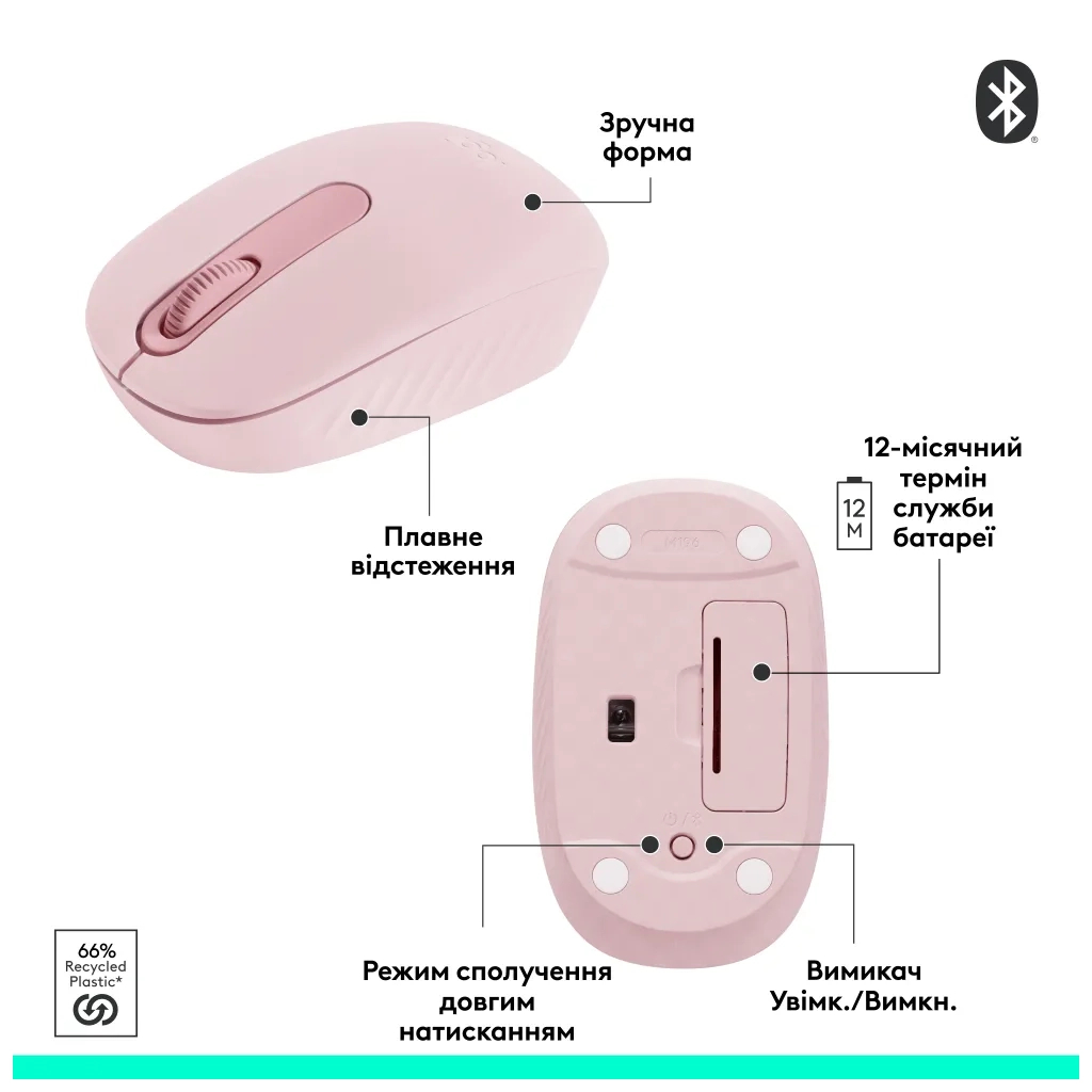 - ВИГОТОВЛЕНИЙ ІЗ ПЕРЕРОБЛЕНОГО ПЛАСТИКУ. ЗРОБЛЕНО НАДОВГО. Пластикові деталі в мишці M196 містять сертифікований перероблений пластик, отриманий після споживання. Включаючи друковані монтажні блоки (PWA) і упаковку (67% для Graphite, і 66% Off-white і Rose)