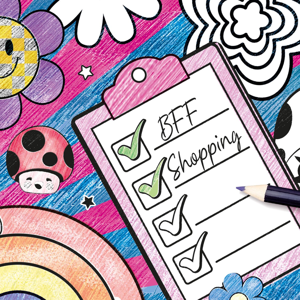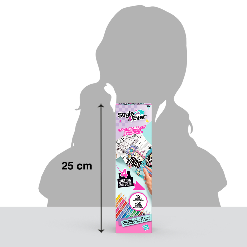 - Комплектація: стрічка розмальовка (4 метри), 2 аркуші стікерів (50 штук), 12 кольорових олівців