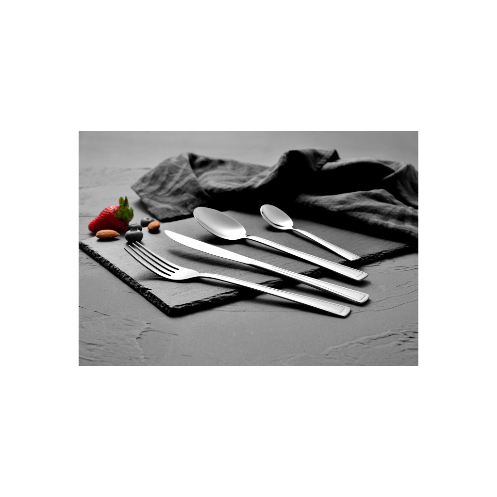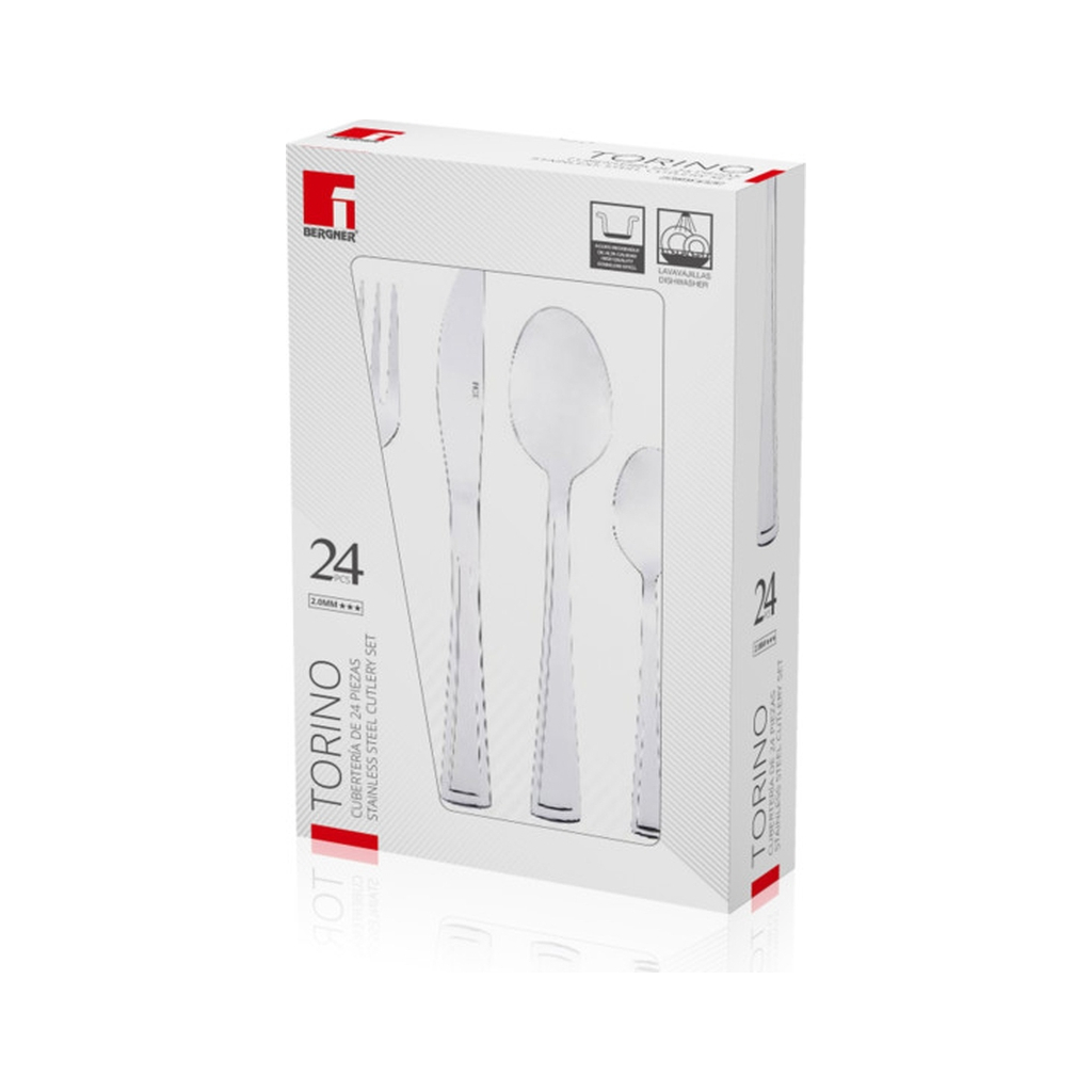 Набір столових приборів Bergner Torino включає 24 предмети, виготовлені з нержавіючої сталі. Цей набір містить ножі, ложки, виделки та чайні ложки, що робить його відмінним вибором для обіду на 6 персон. Виробництво виконано з увагою до деталей, що забезпечує високу якість та довговічність. Продукт можна мити в посудомийній машині, що додає зручності у використанні.