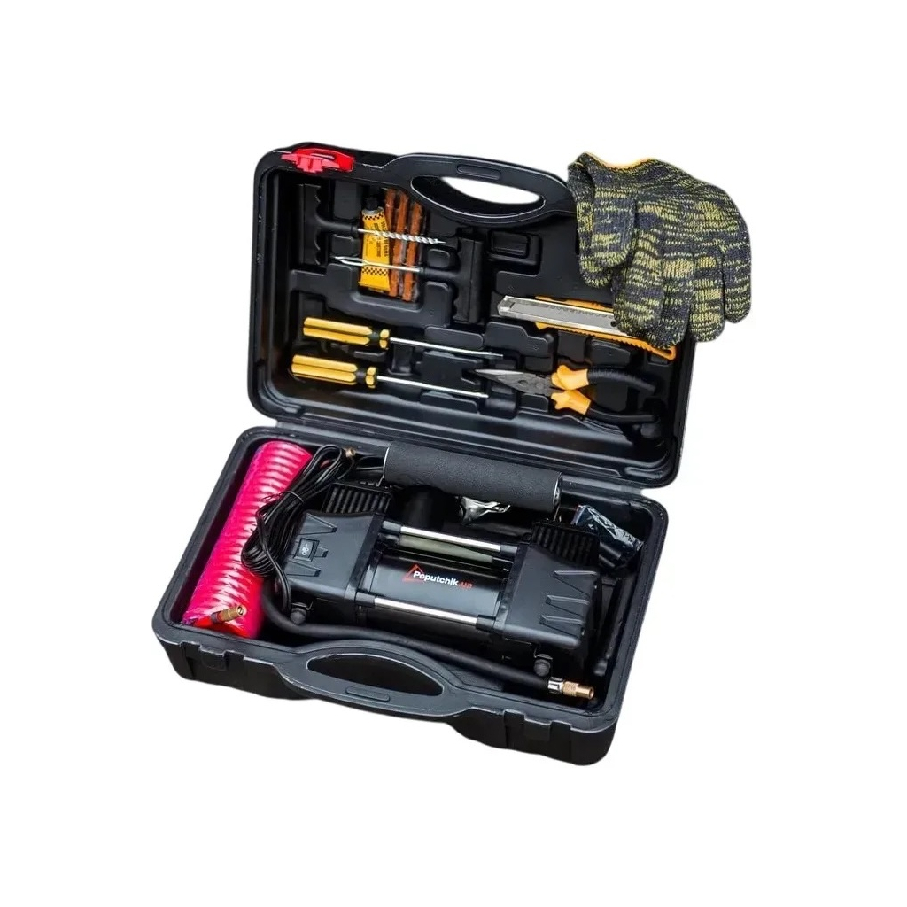 - Компресор автомобільний 2-поршневий Poputchik: Підходить для коліс R 13 – 23, продуктивність: 85 л/хв, максимальний тиск: 10 АТМ.