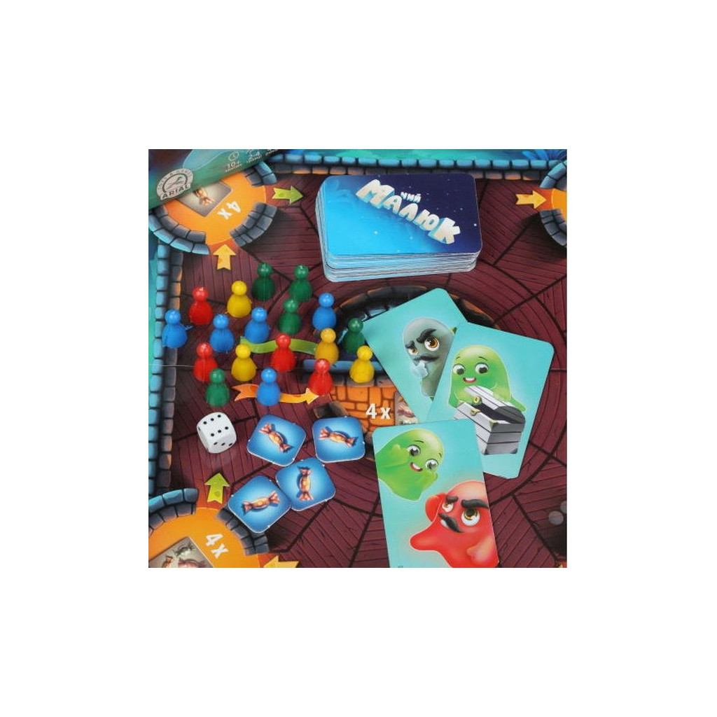- Комплектація: ігрове поле, фішка-тато-приведення, 8 фішок малюків 4 кольорів, 20 фішок солодощів, кубик, правила гри