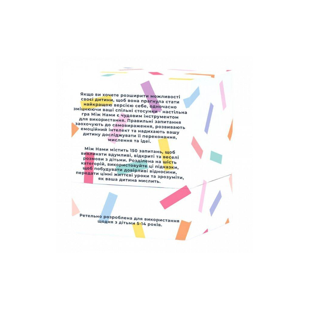 Основні технічні характеристики: виробник – Memo Games, модель – Між нами kids, українська, тематика – карткові, жанр – інтелектуальні. Гра містить 150 карток з питаннями з 6 категорій, виготовлена з картону та має компактні розміри коробки 9.5 х 7 см. Гра доступна українською мовою, що робить її ще більш привабливою для українських дітей.