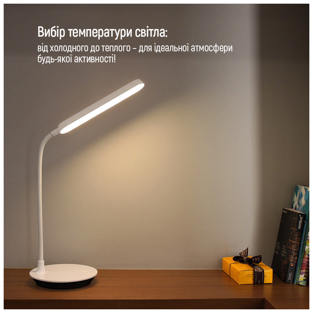 Ця лампа має потужність 4W та вбудований акумулятор ємністю 1800 mAh, що забезпечує тривалу автономну роботу. Вона підтримує змінну кольорову температуру: холодний, нейтральний та теплий білий, що дозволяє створити комфортну атмосферу в будь-якому приміщенні. Лампа живиться від USB, мережі 220 В або вбудованого акумулятора, що робить її надзвичайно зручною у використанні.