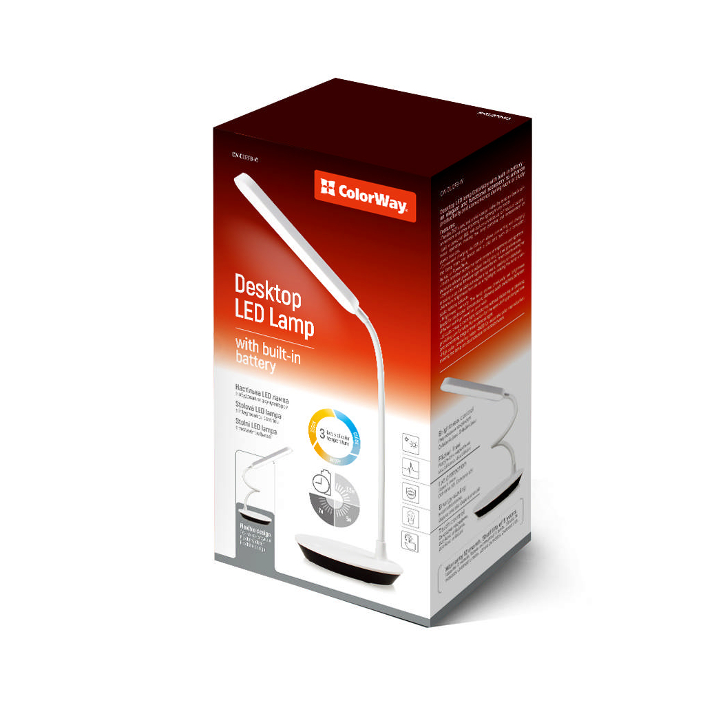 Серед особливостей ColorWay Portable & Flexible 360 – сенсорний вимикач та регулятор яскравості, що дозволяє вам легко налаштовувати інтенсивність світла. Її компактні розміри (ширина 16 см, висота 46.5 см, глибина 31.5 см) роблять лампу ідеальною для будь-якого робочого простору. Виготовлена з якісного пластику, вона має стильний білий колір, що вписується в будь-який інтер'єр.