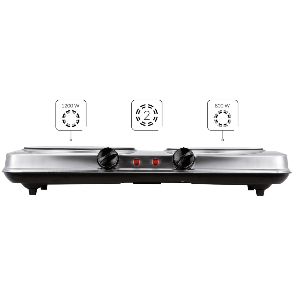 Ця електрична плита має дві конфорки з діаметрами 180 мм і 160 мм, що дозволяє готувати декілька страв одночасно. Вона оснащена поворотними перемикачами для зручного управління та має вхідну потужність 2000 Вт. Розміри плити складають 47 х 7 х 24 см, а вага – лише 2.5 кг, що робить її легкою та портативною.
