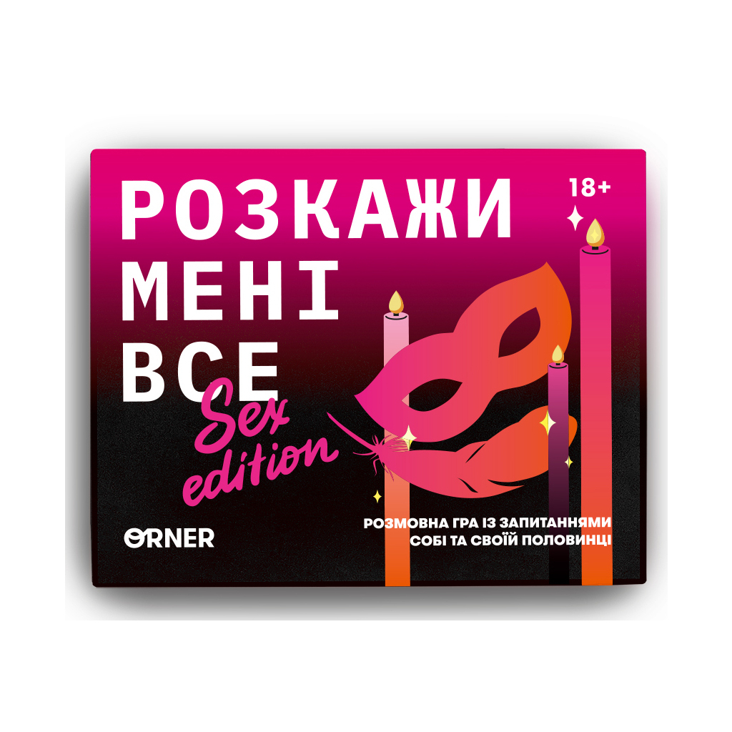 Настільна гра 18+ Orner Розмовна гра Розкажи мені все! Sex edition — це унікальна можливість для пар відкрити нові грані своїх інтимних стосунків. У грі ви знайдете 120 запитань та 30 завдань, які допоможуть вам поглибити взаєморозуміння та зблизитися ще більше. Відкидайте сором’язливість і насолоджуйтеся відвертими розмовами!