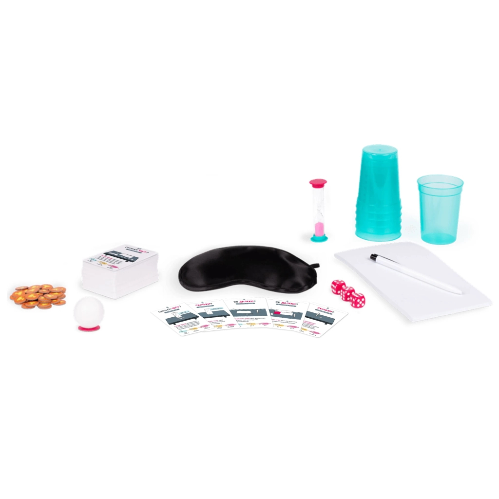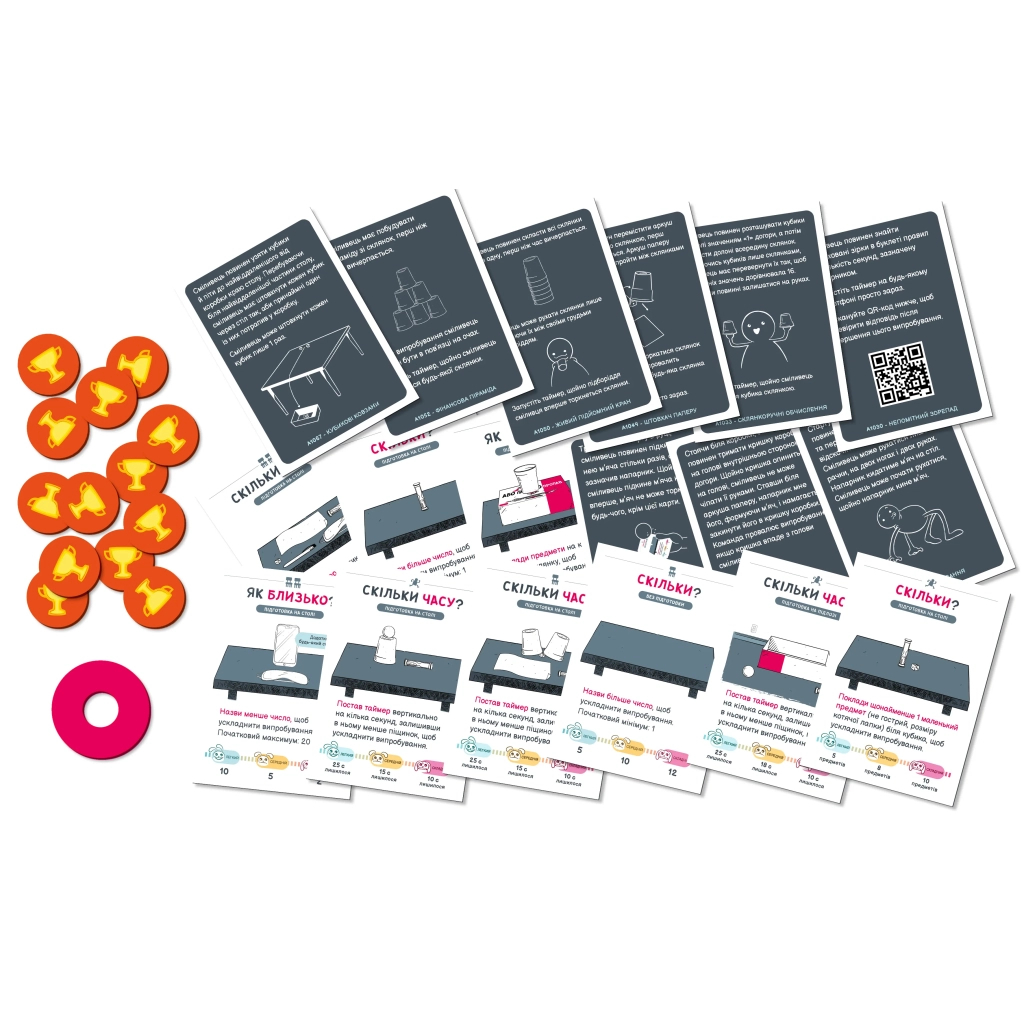 - Комплектація: 149 карт випробувань, 40 жетонів окулярів, 1 підставка для м’яча, 6 склянок, 1 м’яч, 3 кубики, 1 ручка, 30-секундний таймер, 1 блокнот, 1 пов’язка на очі