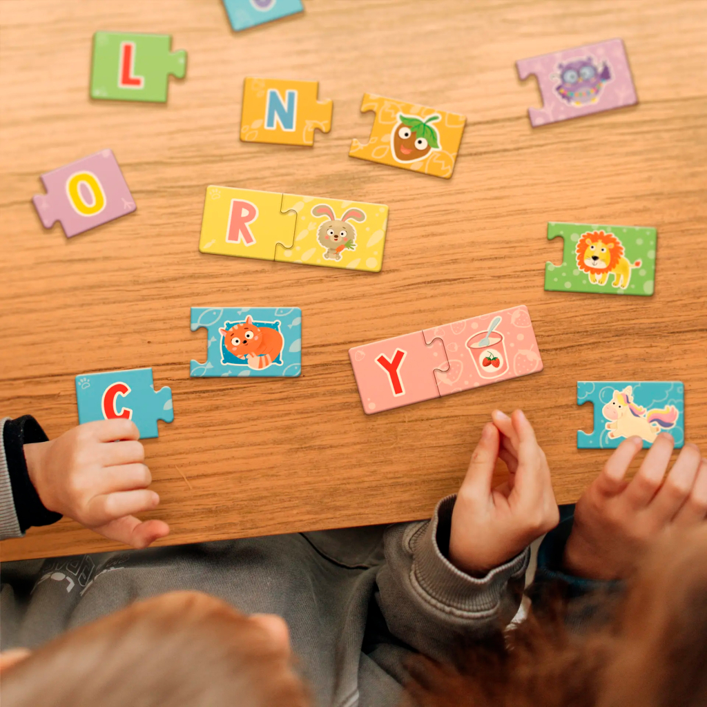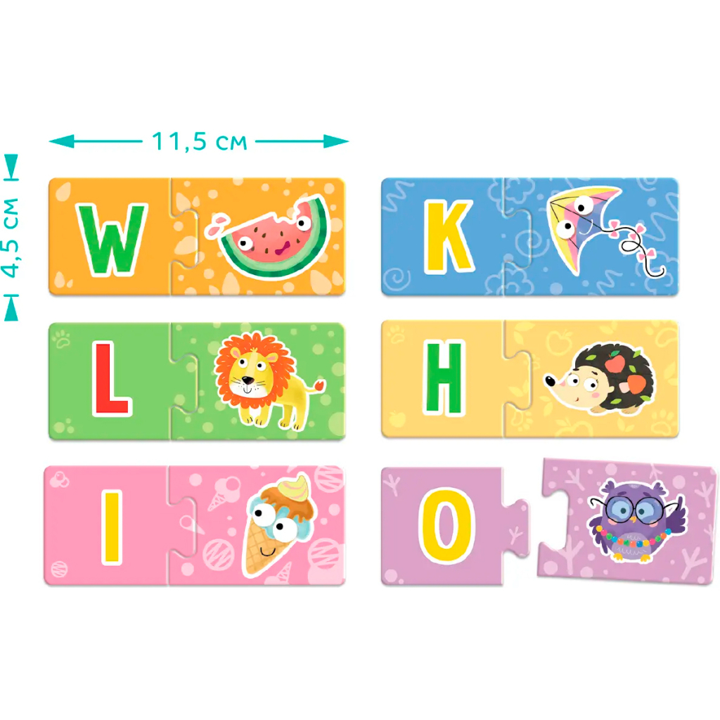 Цей навчальний набір складається з 26 карток, на кожній з яких представлено букву англійського алфавіту та відповідний образ. Пазли, що складаються з двох елементів, сприяють розвитку логічного мислення та моторики у дітей. Використання такого набору робить навчання більш інтерактивним і цікавим, що допомагає дітям швидше запам'ятовувати нову інформацію та розвивати мовні навички.