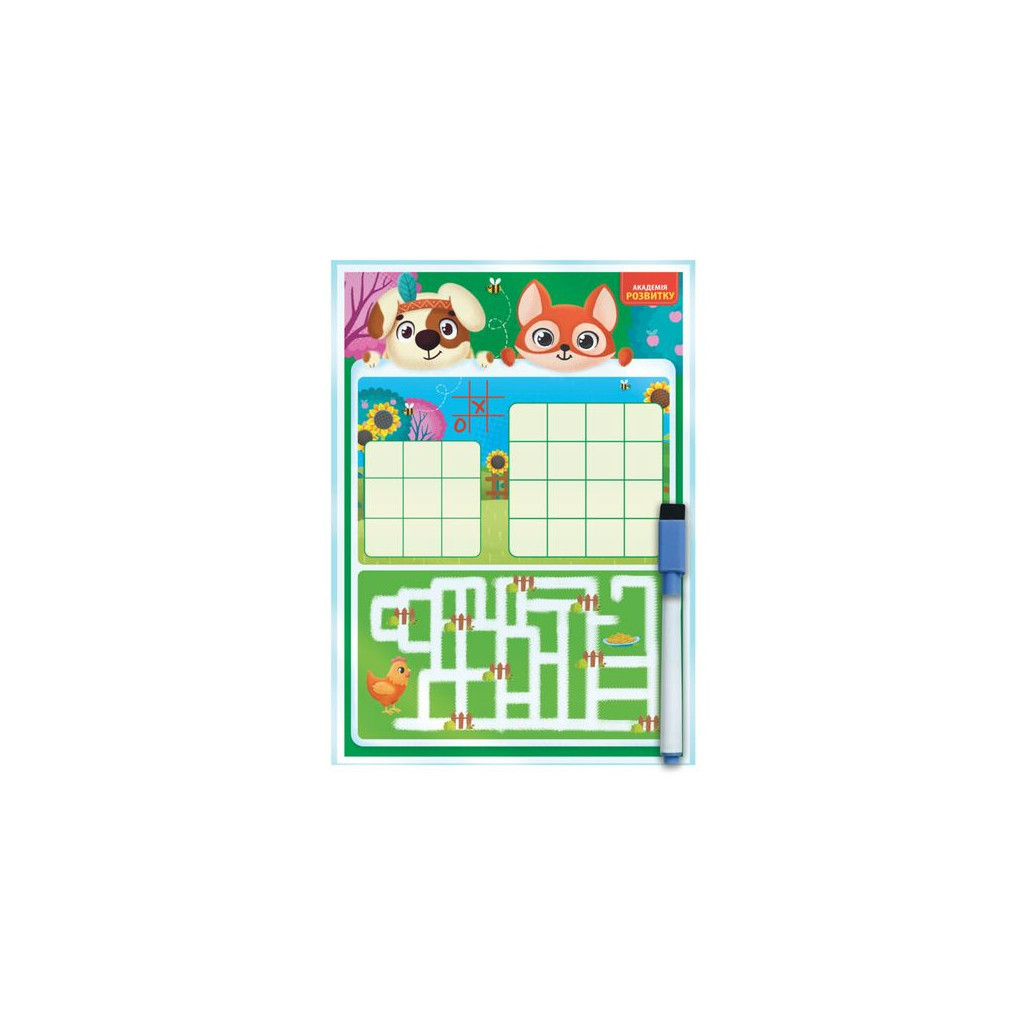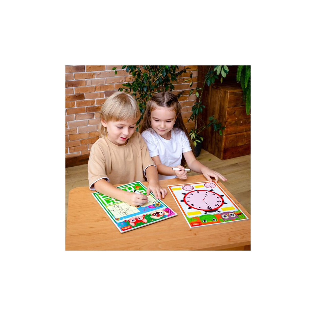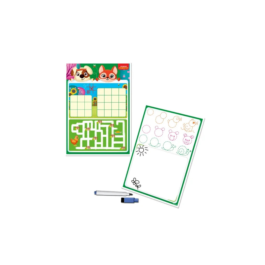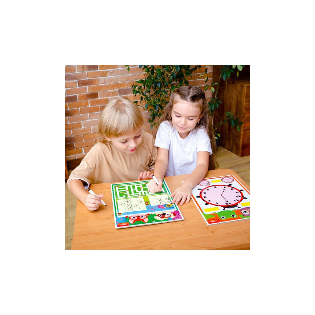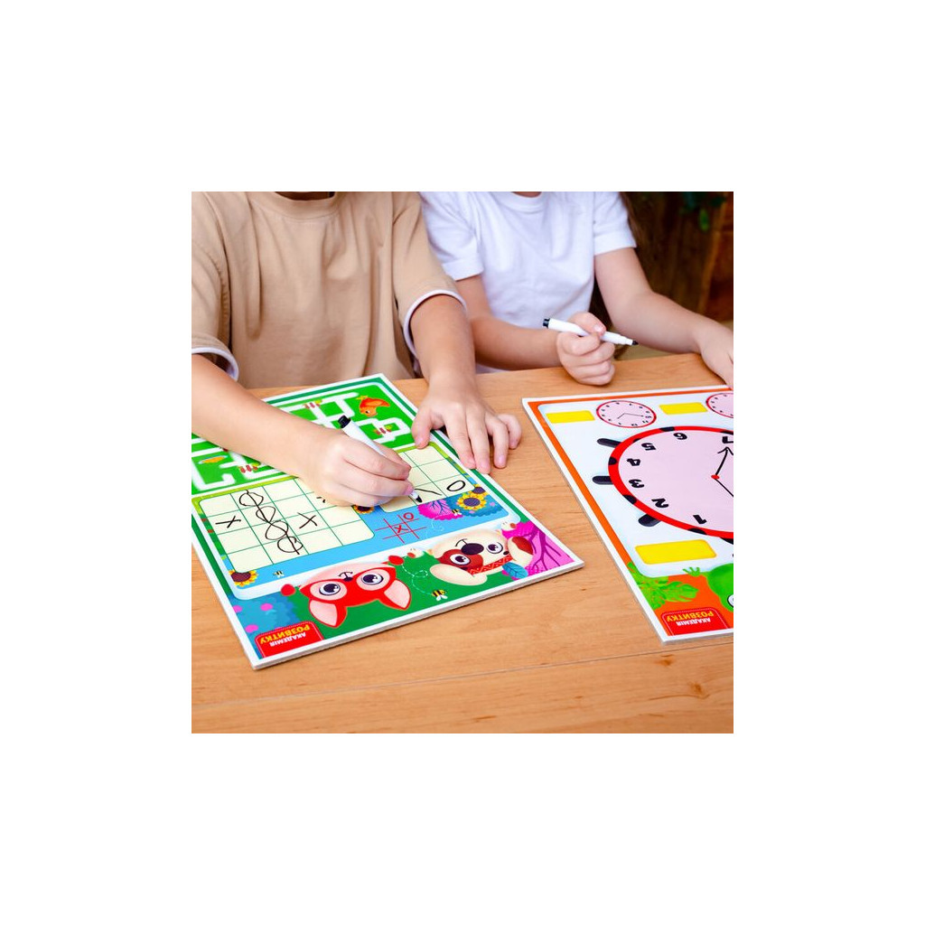 Набір містить двосторонню дошку та багаторазовий маркер. З кожного боку зображені цікаві завдання та ігри.