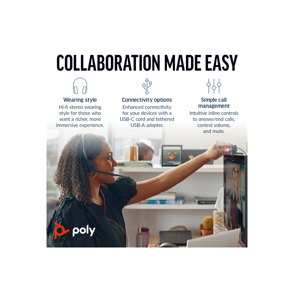 Poly BlackWire C3215 — гарнітура, оптимізована для офісного використання та інтернет-спілкування, оснащена всіма необхідними технологіями для чіткого звуку та якісного голосу під час дзвінка. Динамічний еквалайзер оптимізує якість вашого голосу під час дзвінків та автоматично регулює власні налаштування, щоб отримати в результаті високоякісний звук для прослуховування музики чи відтворення мультимедіа.