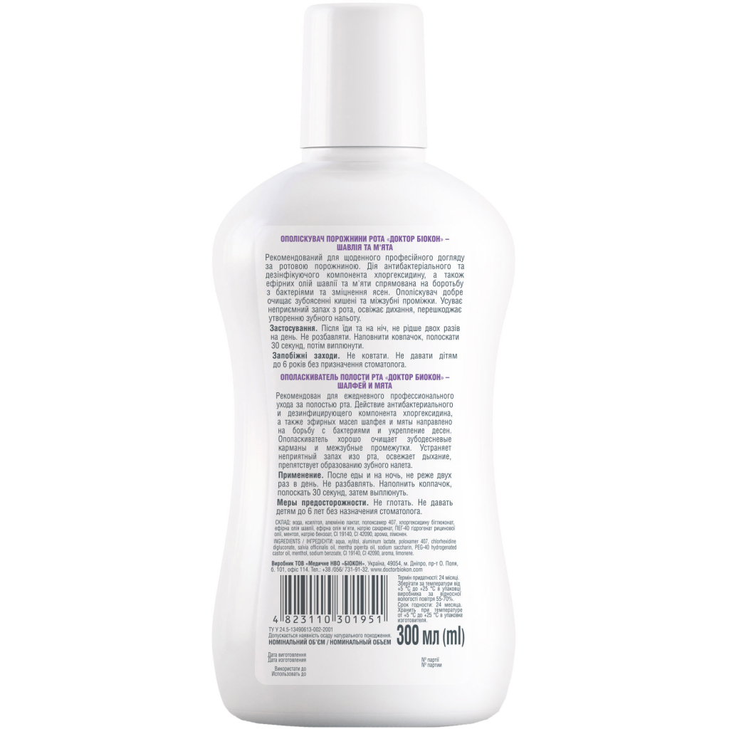 Ополіскувач для порожнини рота Біокон Доктор Біокон Шавлія і м’ята 300 мл – це ідеальний засіб для щоденного догляду за зубами. Щоб усмішка тішила сяйвом і білизною, важливо забезпечити комплексний догляд, який включає ополіскування. Цей продукт має активну формулу з рослинними компонентами, що захищає від шкідливих бактерій, які можуть викликати запалення ясен і проблеми з емаллю.