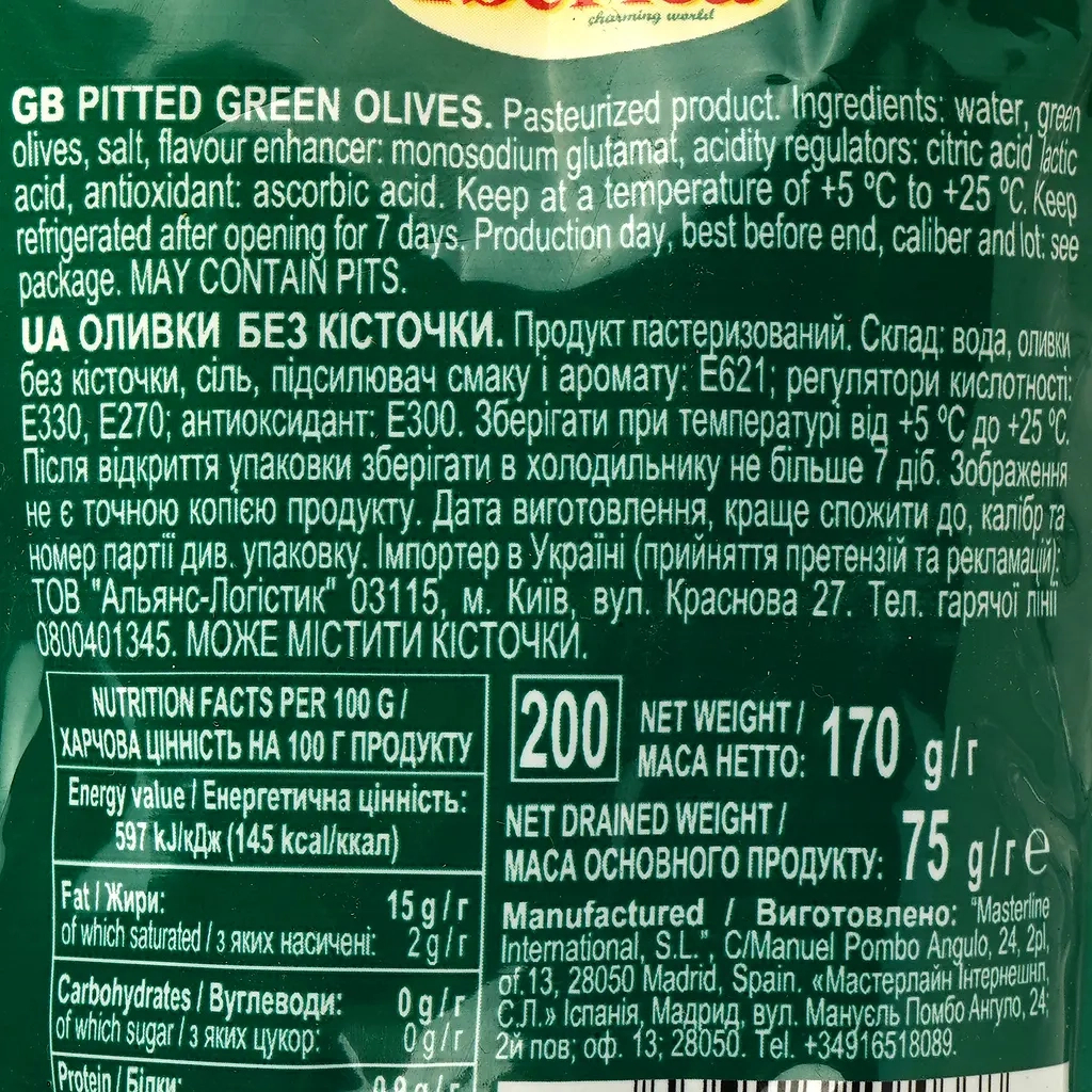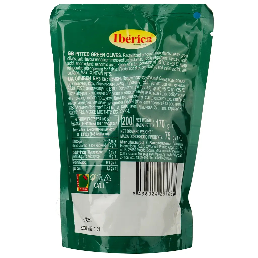 Основні технічні характеристики: виробник – Iberica, модель – Оливки зелені без кісточки, вага – 170 г, упаковка – дой-пак, термін зберігання – 36 місяців, країна-виробник – Іспанія.