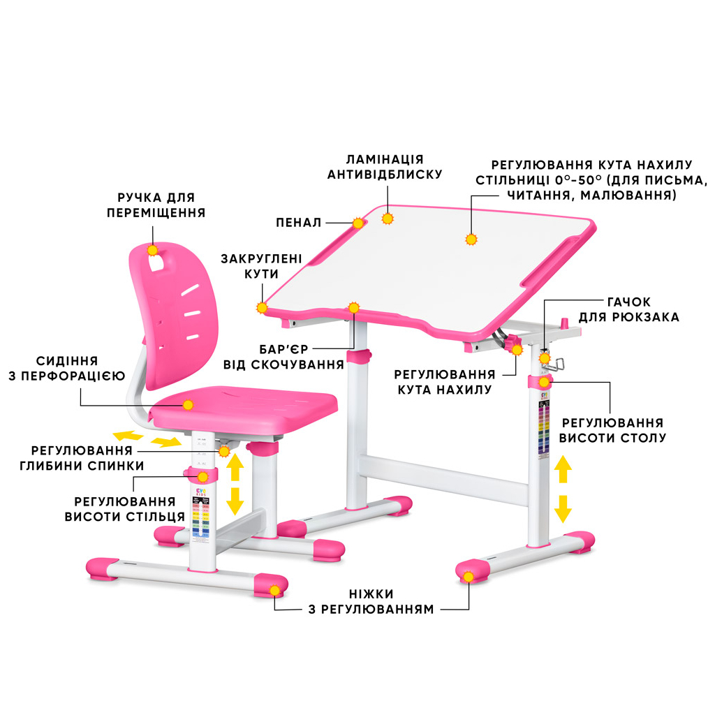 Парти зі стільцем Evo-kids Pink (Evo-07 Ergo PN) – це ідеальне рішення для вашої дитини, яке поєднує в собі комфорт, стиль та функціональність. Призначена для дітей від 3 років, ця одномісна парта стане незамінним елементом у вашому домі, створюючи затишне місце для навчання та творчості.