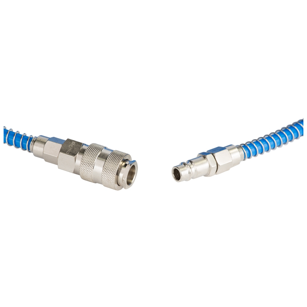 Шланг спіральний поліуретановий (PU) використовується для передачі повітря в пневматичних системах стандартного тиску. Має хорошу стійкість до механічних впливів (перегини, здавлювання, скручування) і швидко відновлює свою первинну форму після зняття механічного впливу. Шланг не схильний до гідролізу і має хорошу стійкість до впливу озону і мікроорганізмів.