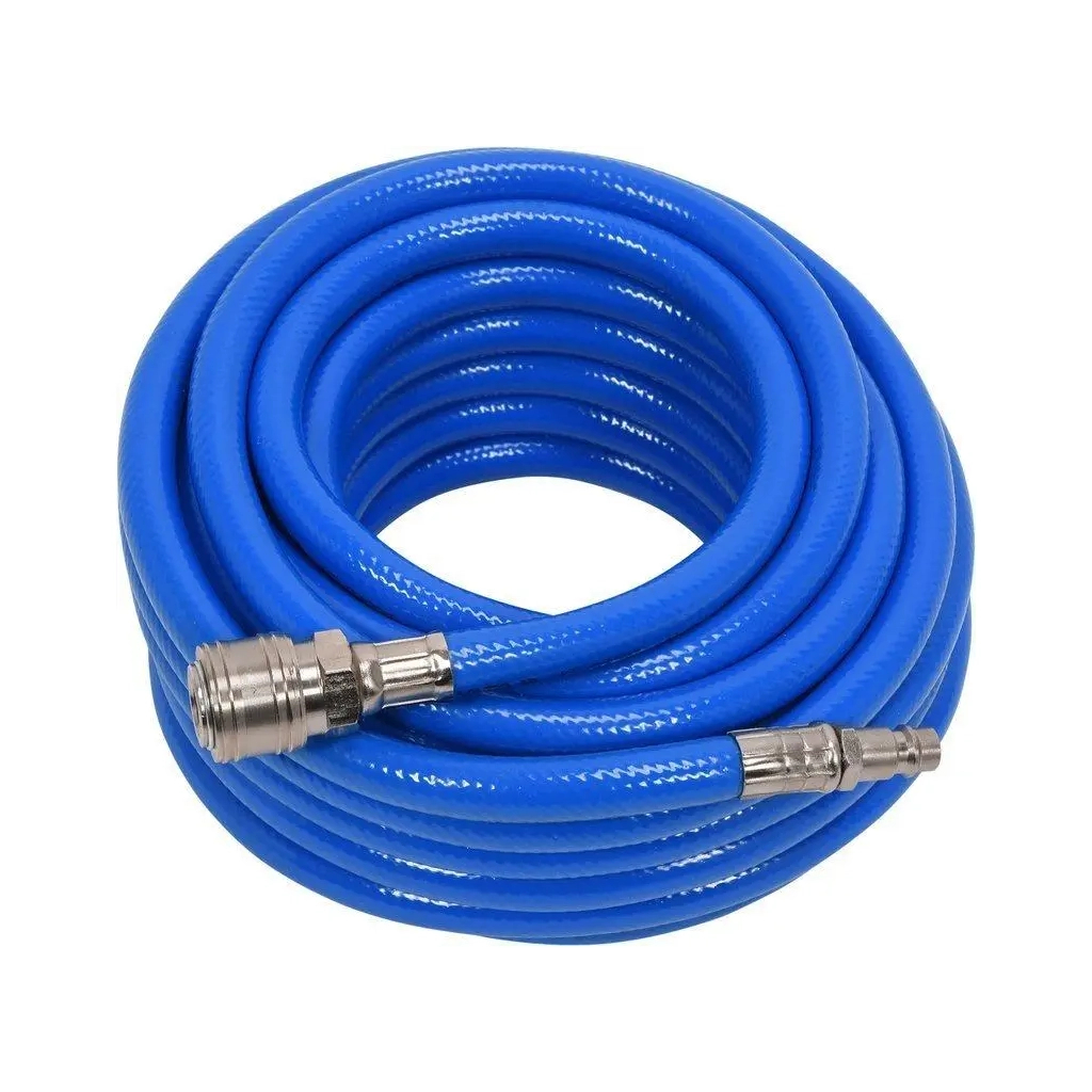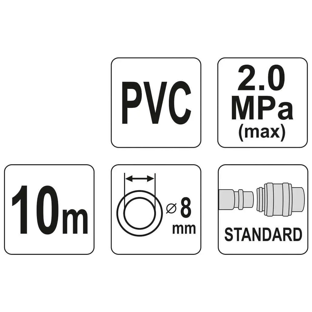 Професійний пневматичний шланг армований з кованими швидкороз’ємними сполуками. Шланг з внутрішнім діаметром 8 мм і довжиною 10 метрів з армованого ПВХ. Шланг стійкий до низьких і високих температур, тому його можна використовувати і за межами майстерні. Це незамінний інструмент в будь-якому цеху або виробничому підприємстві.