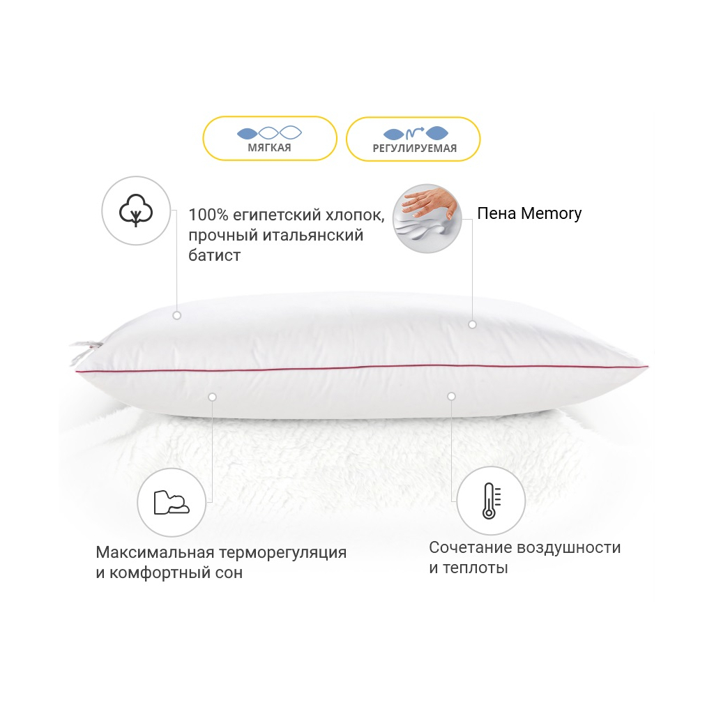 Ця подушка має оптимальну висоту для тих, хто любить низькі та м’які подушки, і рекомендована для дітей та жінок. Вона також регульована, що дозволяє налаштувати комфорт під час сну.