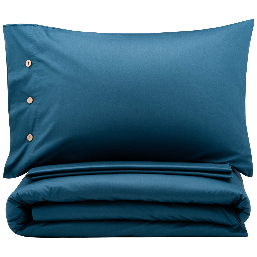 У комплект входять: простирадло (240 x 260 см), підковдра (200 x 220 см) та дві наволочки (50 х 70 см). Дизайн – однотонні моделі, з наволочками на ґудзиках та застібкою на блискавці. Колір – темно-синій. Вироблено в Україні.