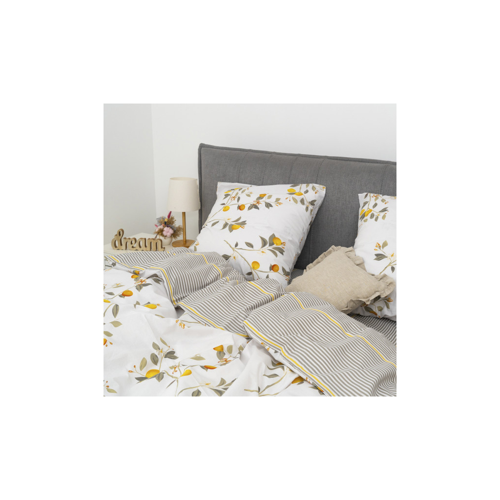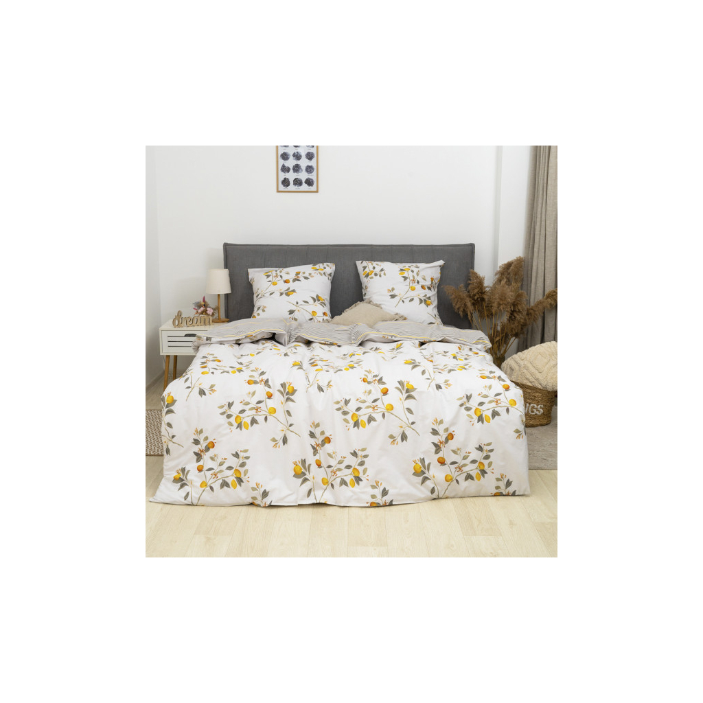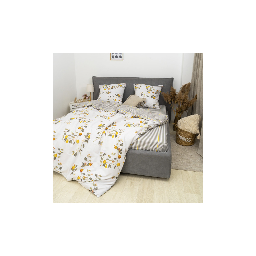 Комплектація включає простирадло, підковдру та дві наволочки. Розміри: полуторний – простирадло 214×150 см, підковдра 210×143 см, наволочки 70×70 см (2 шт.). Прати при температурі до 40°C у делікатному режимі.
