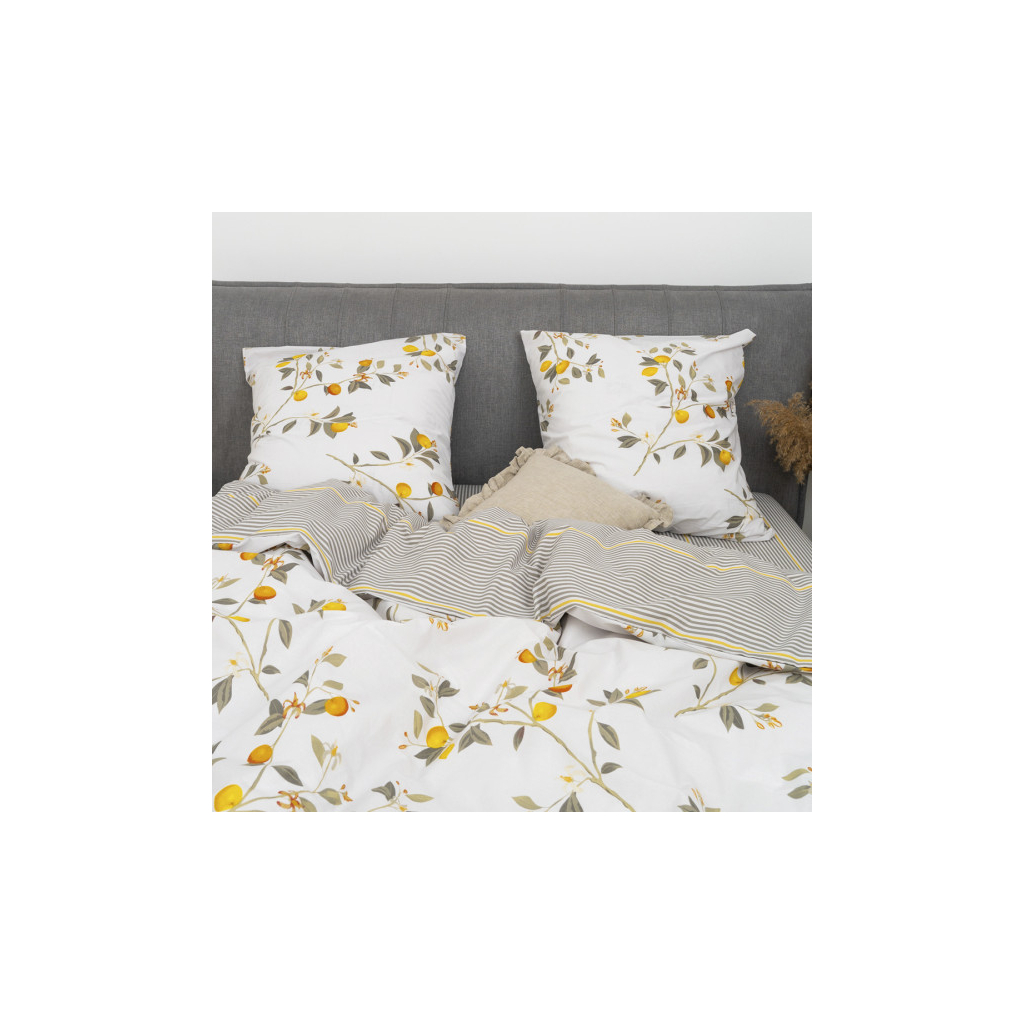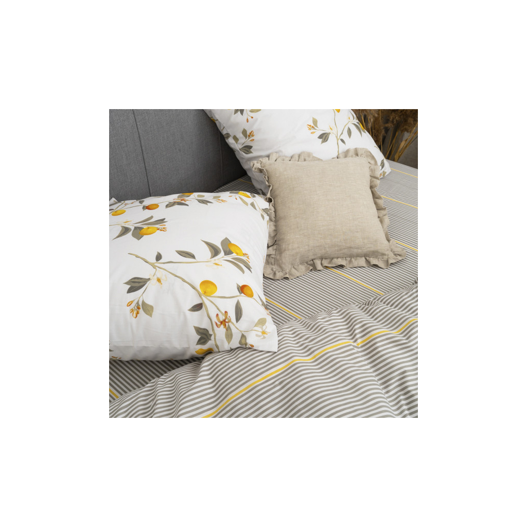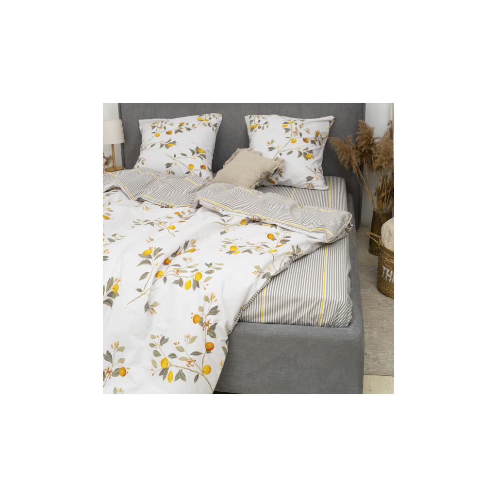 Комплектація включає простирадло, підковдру та дві наволочки. Розміри: полуторний – простирадло 214×150 см, підковдра 210×143 см, наволочки 70×70 см (2 шт.). Прати при температурі до 40°C у делікатному режимі.