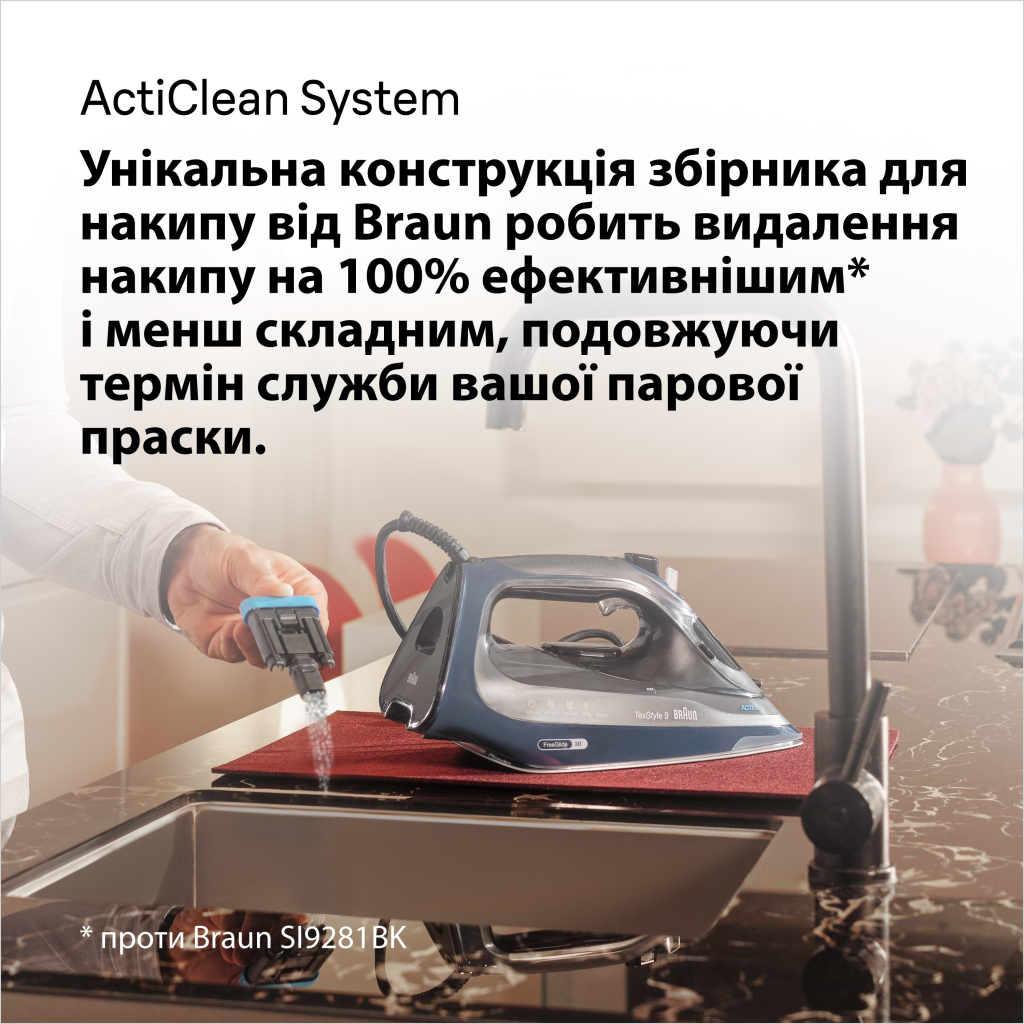 - Унікальна система збору накипу ActiClean автоматично нагадує про необхідність видалення накипу, що подовжує термін служби праски.