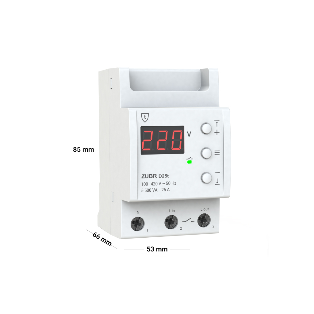 Реле напруги ZUBR D25t (4820120220449) – надійне рішення для захисту електрообладнання від коливань напруги. Завдяки допустимій потужності 5500 Вт, пристрій ефективно працює в робочому діапазоні від 120 до 280 В, забезпечуючи оптимальний захист. Пристрій оснащений дисплеєм, який відображає актуальну напругу та системну інформацію, дозволяючи легко налаштовувати верхню і нижню межі.