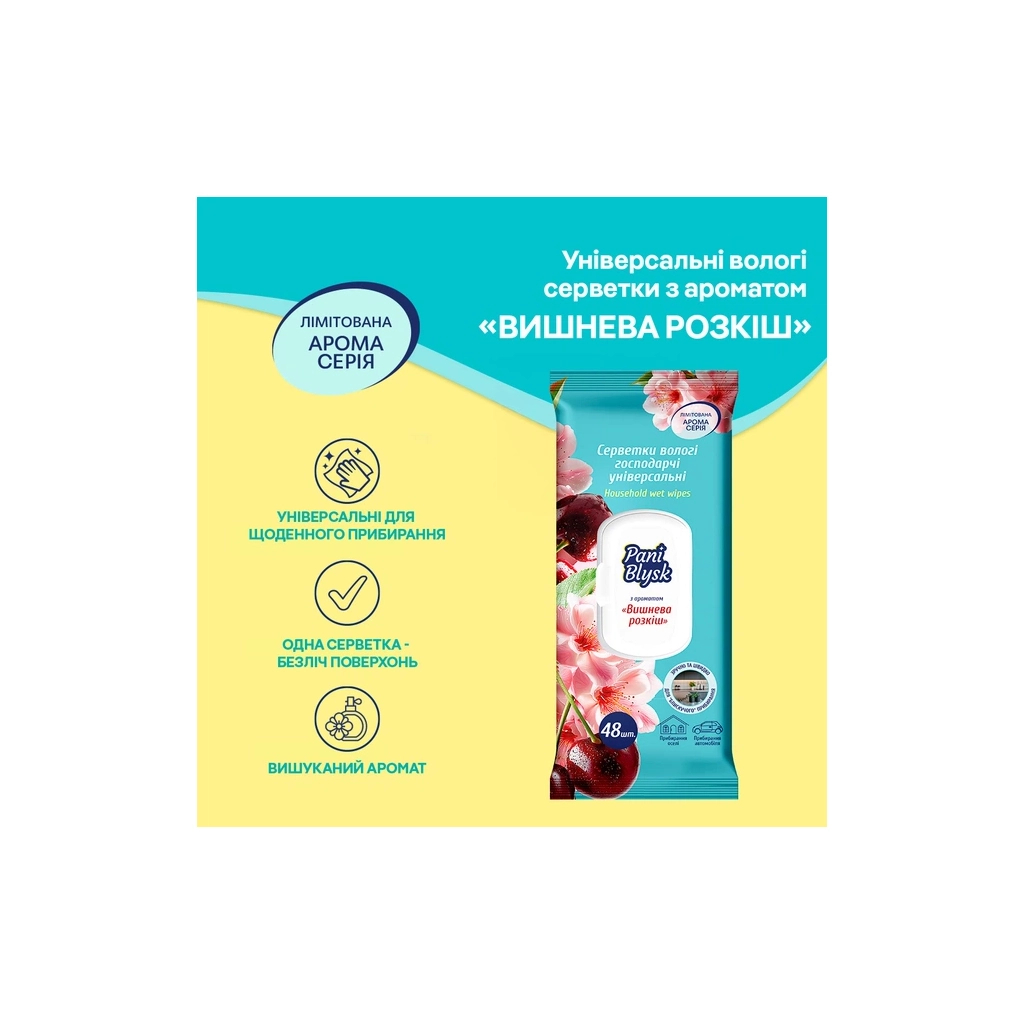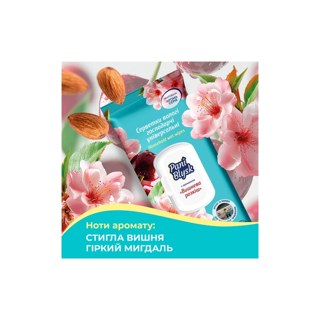 Ноти аромату: стигла вишня, гіркий мигдаль. Арома серветки від Pani Blysk – це коли прибирання стає приємним ритуалом!