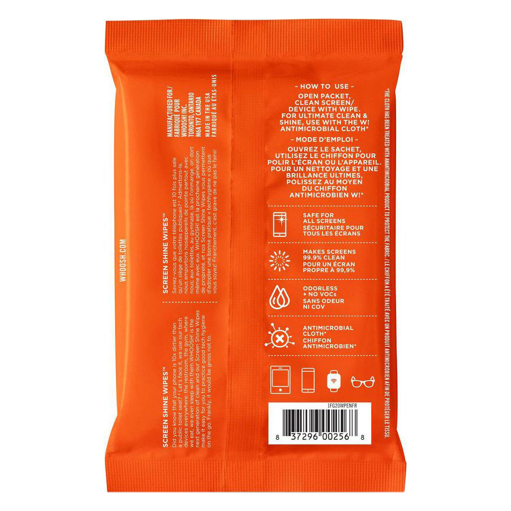 Серветки Whoosh! Screen Shine 20 WIPES 10х7cm + 1microfiber 14х14cm (1FG20WPENFR) — це ідеальне рішення для підтримки чистоти вашої техніки та окулярів у будь-якому місці. Серветки для очищення екранів ефективно видаляють відбитки пальців, пил та бруд з екранів гаджетів, лінз окулярів та інших поверхонь. Безпечна нетоксична формула очищувального засобу, що не містить спирту та аміаку, дбайливо очищає екрани із захисним покриттям, антивідблиском, а також оптичні рецептурні лінзи окулярів, не завдаючи їм шкоди.
