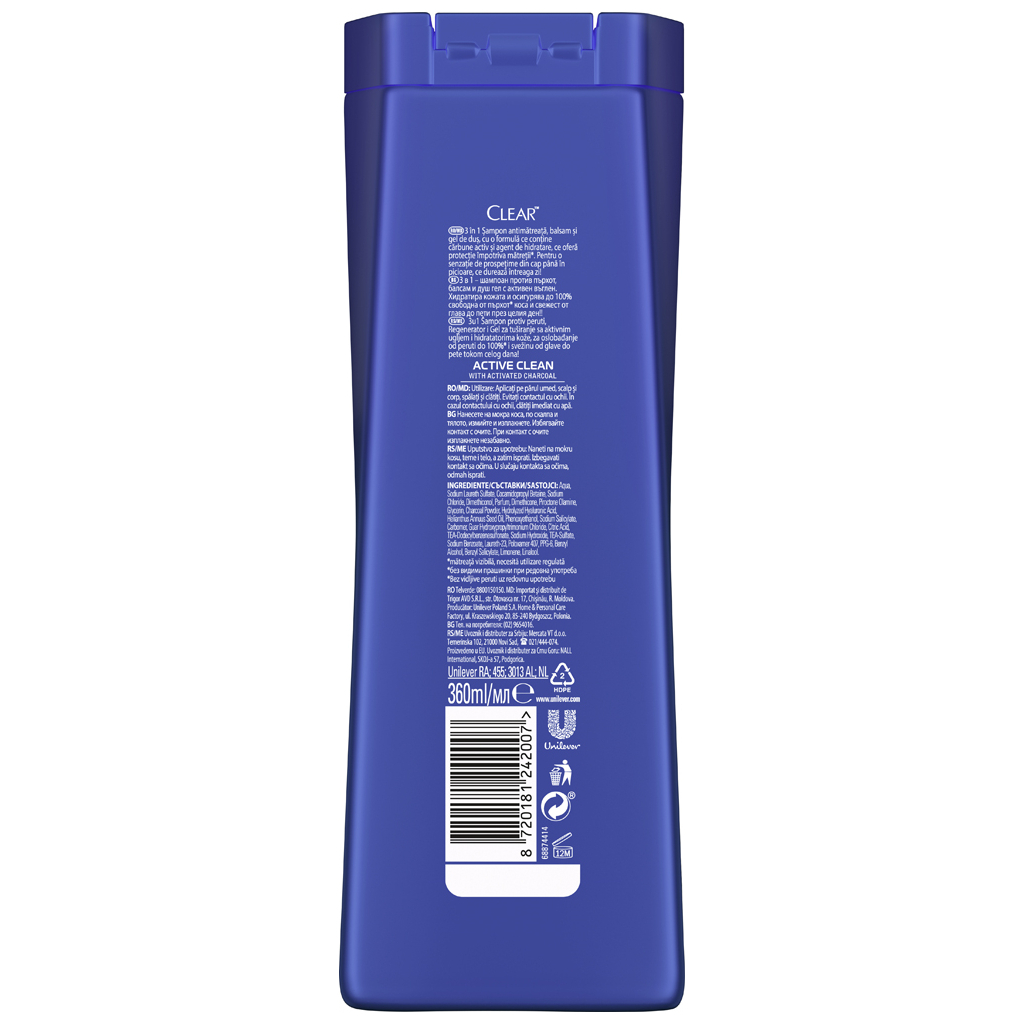 Шампунь Clear 3 в 1 З активованим вугіллям для чоловіків – ідеальний вибір для очищення волосся всіх типів. Об'єм 360 мл забезпечує тривале використання, а активоване вугілля глибоко очищає шкіру голови, видаляючи забруднення та надлишок жиру.