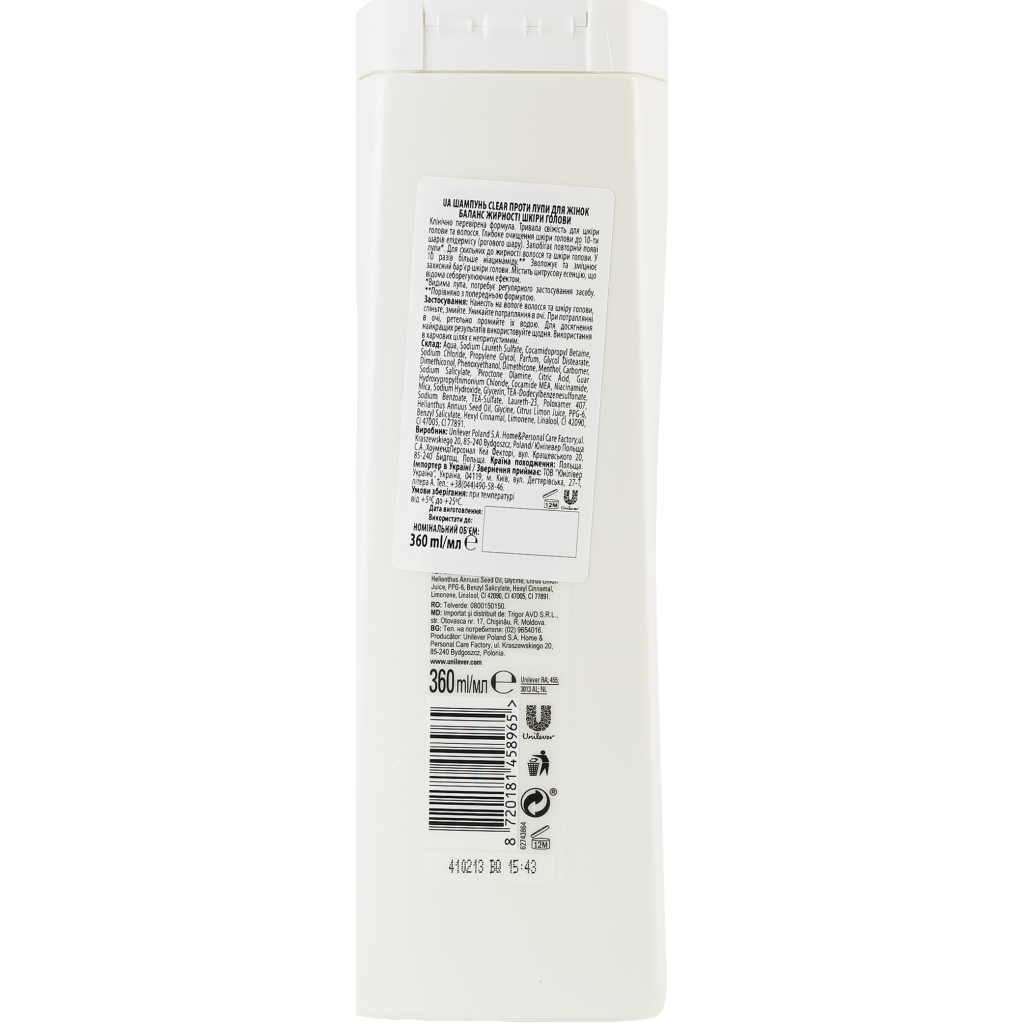 Шампунь Clear Проти лупи для жінок “Баланс жирності шкіри голови” об’ємом 360 мл – це ідеальний засіб для догляду за волоссям, схильним до утворення лупи та надмірної жирності. Вироблений у Польщі, цей шампунь належить до категорії мас-маркету, поєднуючи високу якість і доступність. Завдяки унікальній цитрусовій есенції, шампунь створює відчуття свіжості, яке триває до 48 годин. Ця есенція не лише освіжає, але й контролює вироблення себуму, забезпечуючи баланс шкіри голови.