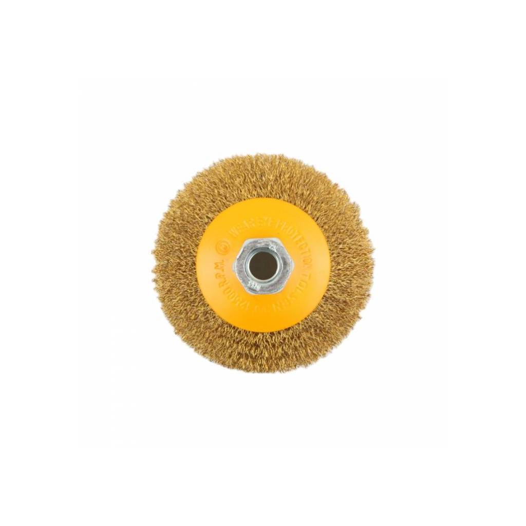 Ця щітка призначена для використання з болгарками і виготовлена з якісних матеріалів, що забезпечують тривалий термін служби. Завдяки рифленій формі дроту та латунному покриттю, вона ефективно видаляє іржу, залишки фарби та інші забруднення з різних поверхонь.